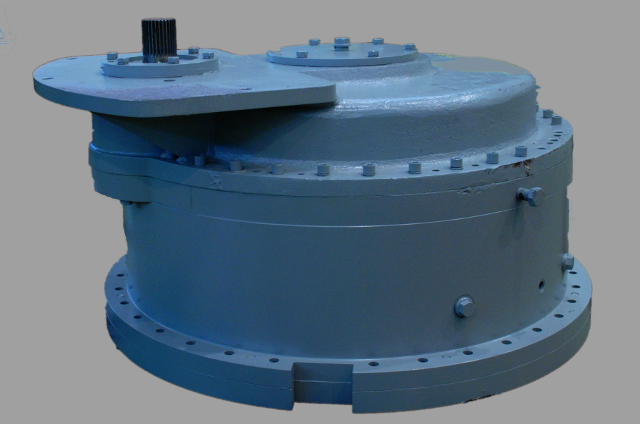 行走減速機(jī)安裝在履帶架上,由電機(jī)牽引驅(qū)動(dòng)挖掘機(jī)的走行;回轉(zhuǎn)減速機(jī)安裝在回轉(zhuǎn)平臺(tái)上,為行星結(jié)構(gòu)一級(jí)減速機(jī),電機(jī)驅(qū)動(dòng)減速機(jī),減速機(jī)輸出軸通過(guò)聯(lián)接回轉(zhuǎn)立軸齒輪與回轉(zhuǎn)大齒圈嚙合,實(shí)現(xiàn)挖掘機(jī)的回轉(zhuǎn)運(yùn)動(dòng);提升減速機(jī)為挖掘機(jī)提升機(jī)構(gòu)的主傳動(dòng)設(shè)備,用于驅(qū)動(dòng)提升卷筒;推壓減速機(jī)位于起重臂上,減速機(jī)輸出軸聯(lián)接小齒輪與斗桿齒條嚙合,驅(qū)動(dòng)齒條左往復(fù)運(yùn)動(dòng),與提升機(jī)構(gòu)一起工作實(shí)現(xiàn)鏟斗挖掘作業(yè)。