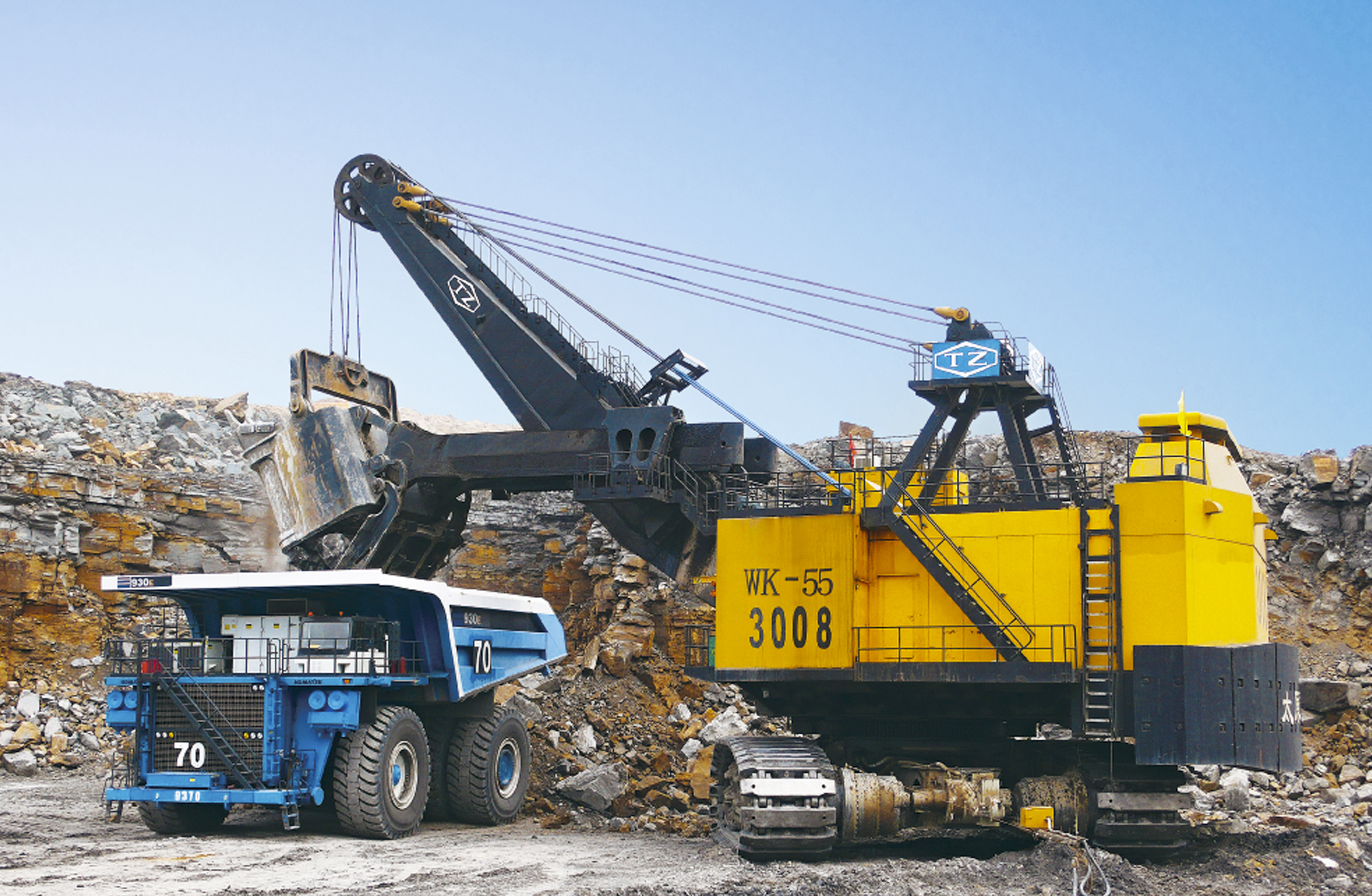 WK-55礦用挖掘機與220-363t礦用汽車配套使用,也適用于5000t/h-7500t/h自移式破碎站,用于兩千萬噸級及以上大型露天煤礦、鐵礦及有色金屬礦山的剝離和采裝作業(yè)