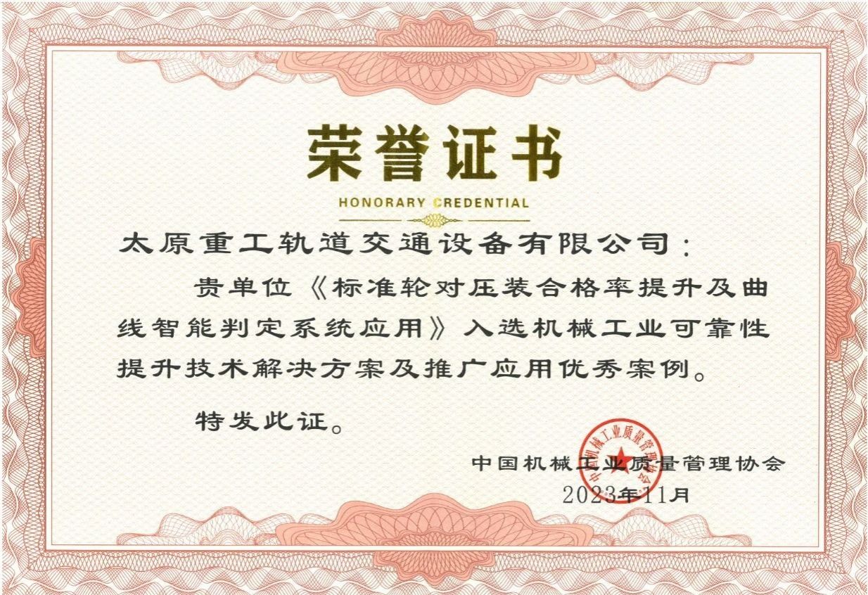 近日,在第八屆全國機械工業(yè)可靠性技術(shù)應(yīng)用交流大會上,太重軌道公司《標(biāo)準(zhǔn)輪對壓裝合格率提升及曲線智能判定系統(tǒng)應(yīng)用》項目榮獲機械工業(yè)可靠性提升技術(shù)解決方案及推廣應(yīng)用優(yōu)秀案例,是山西省唯一入選該獎項的企業(yè)。