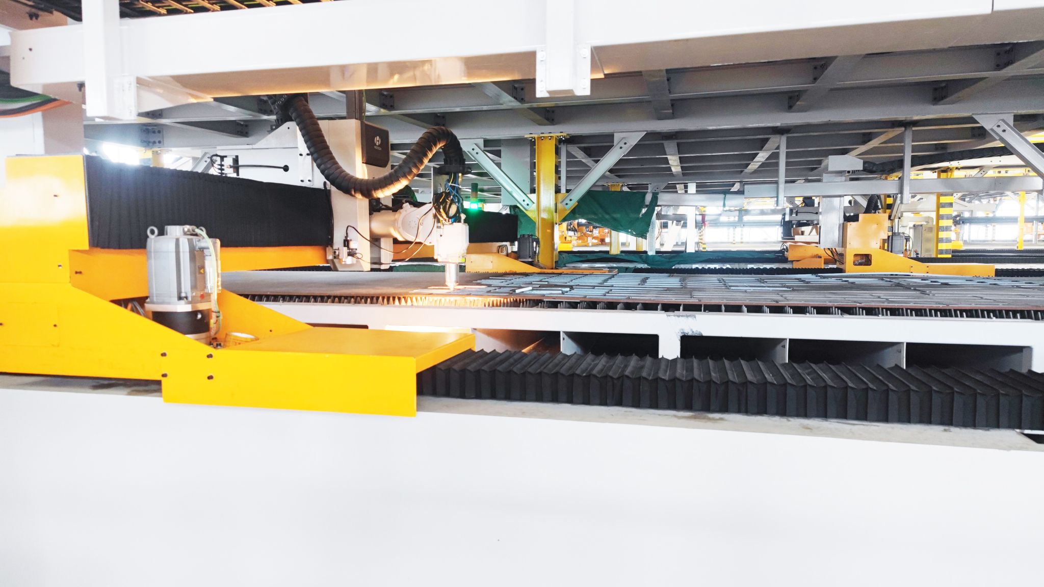 一張鋼板,經(jīng)過出入庫(kù)、拋丸、校平、上下料、對(duì)中、噴碼、輸送、切割、分揀、砂光、碼垛、物流轉(zhuǎn)運(yùn)全流程自動(dòng)運(yùn)行,即可輸出一批高質(zhì)量合格零件,下料工序周期大大縮短?!斑@條實(shí)現(xiàn)全過程智能化管控的黑燈產(chǎn)線,效率提升70%,綜合材料利用率高達(dá)90%,滿產(chǎn)下每年可節(jié)約成本4000萬(wàn)元以上?!敝悄芗庸づ渌椭行目偨?jīng)理史亞杰說。
