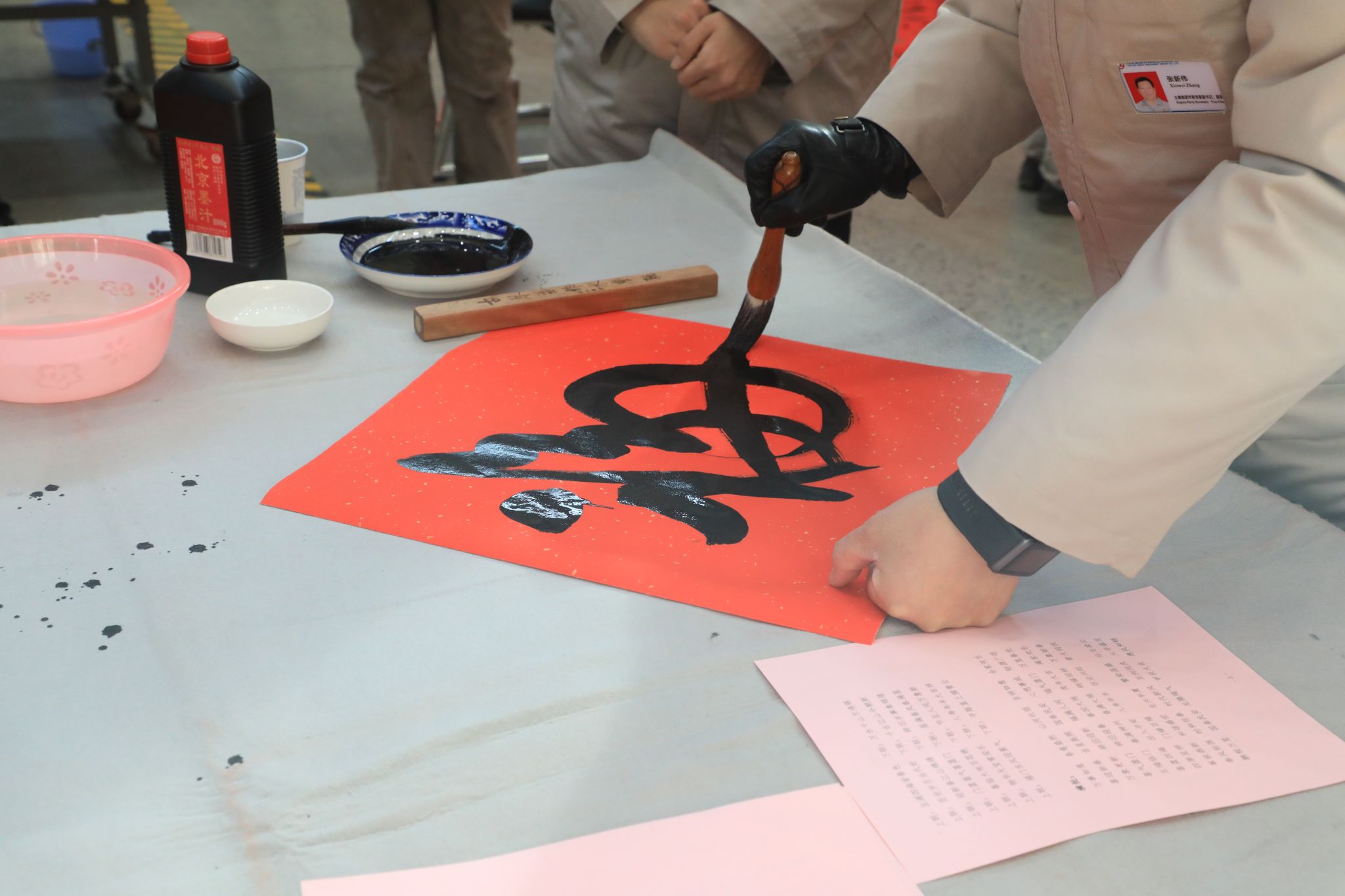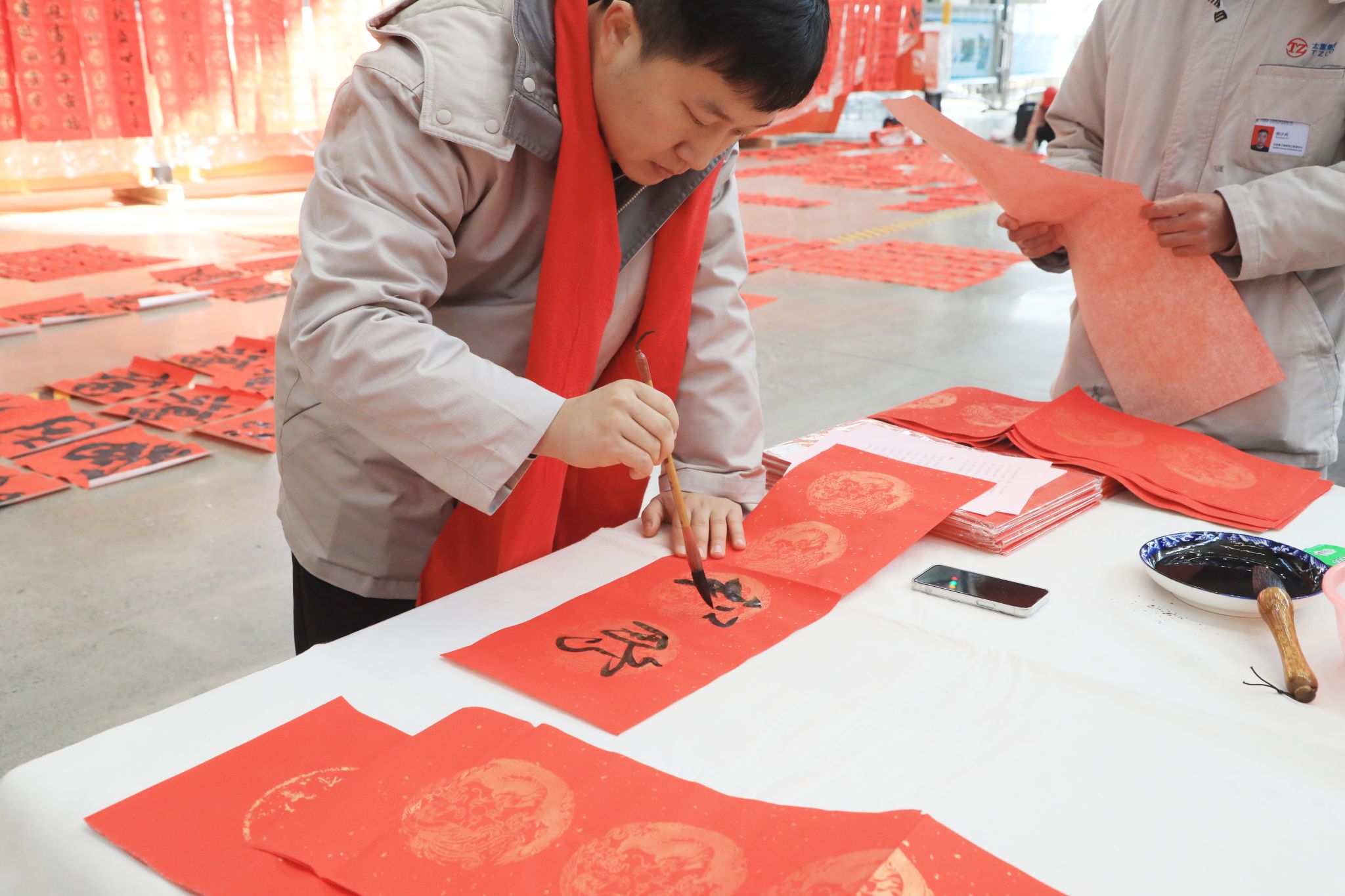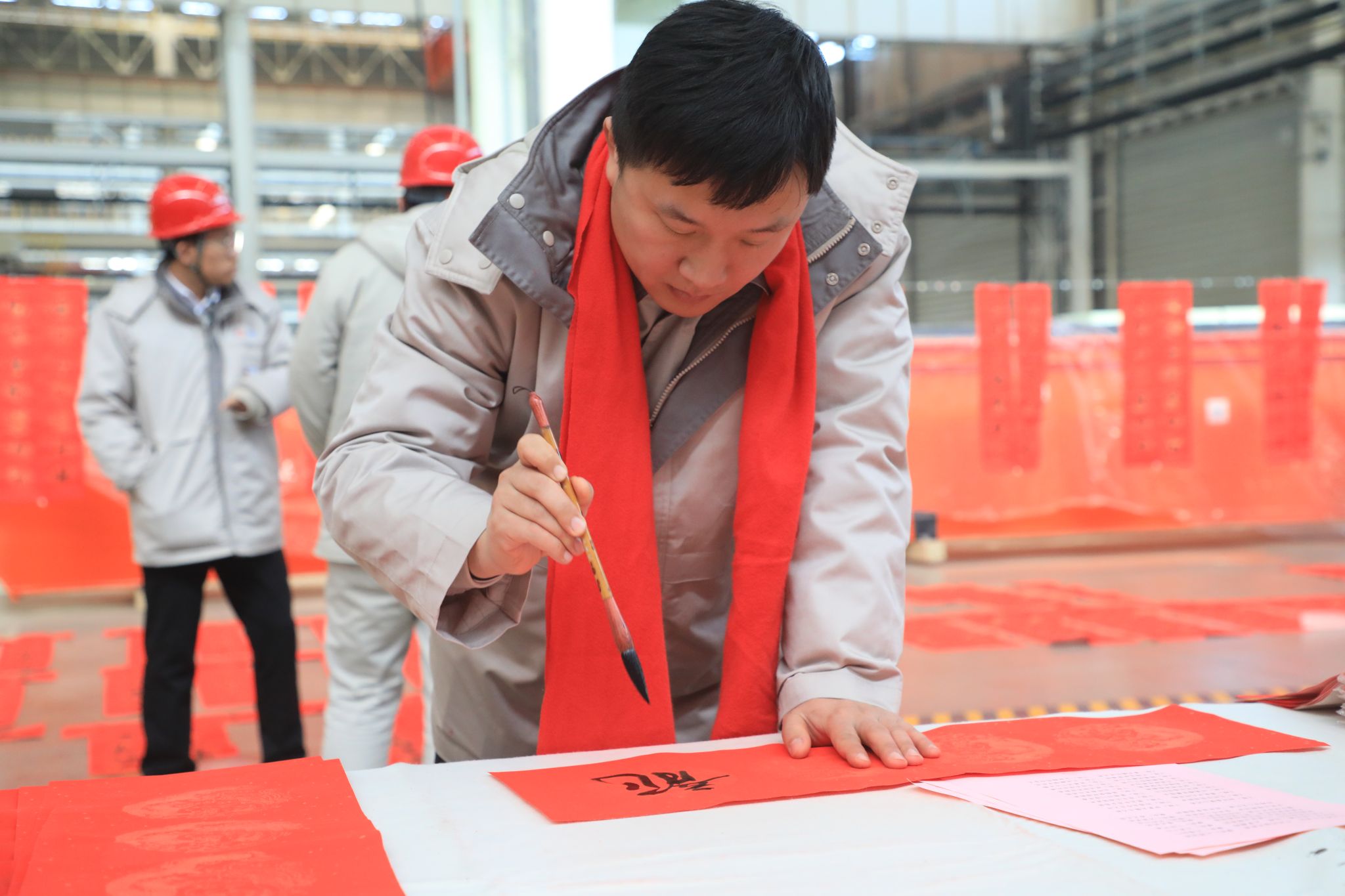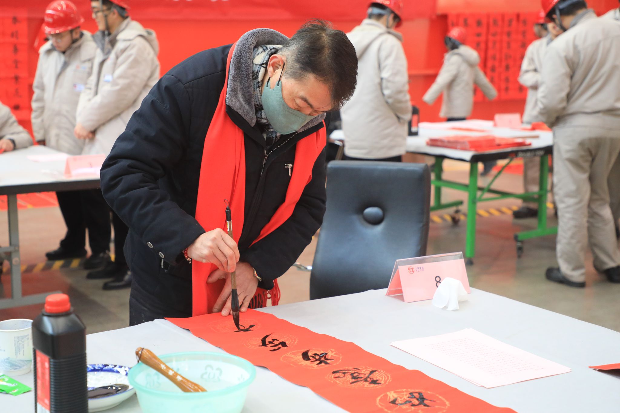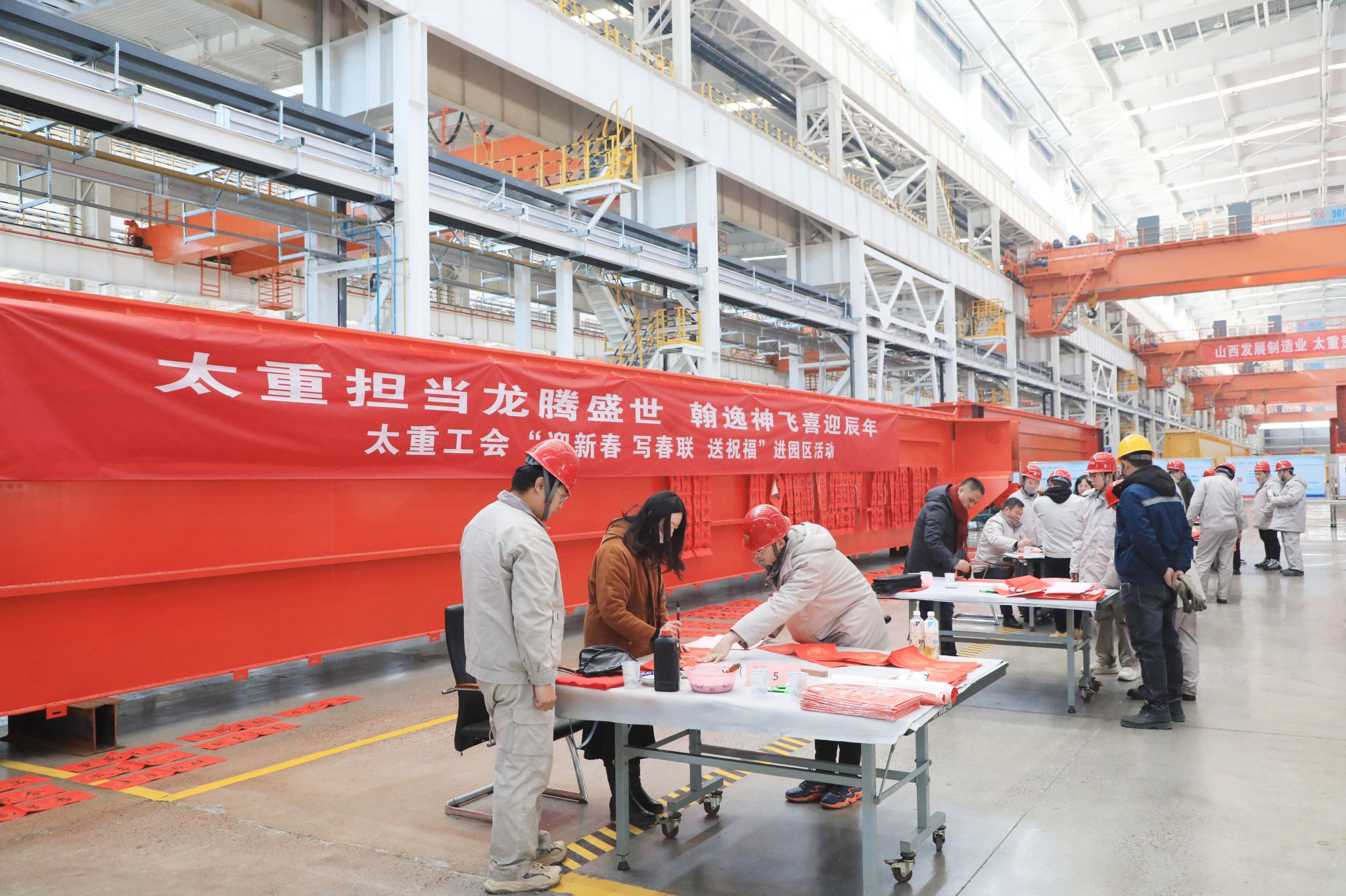 為豐富職工文化生活、喜迎龍年新春,1月23日,公司工會舉辦“迎新春 寫春聯(lián) 送祝?!边M(jìn)園區(qū)活動,在太重智能高端裝備產(chǎn)業(yè)園區(qū)加工裝配聯(lián)合廠房,來自省內(nèi)的知名書法家和公司書法愛好者們齊聚一堂,為各子分公司職工義務(wù)書寫春聯(lián),以這種喜慶的形式向廣大干部職工送上春節(jié)的祝福。集團公司黨委專職副書記、副董事長、工會主席張新偉參加活動。