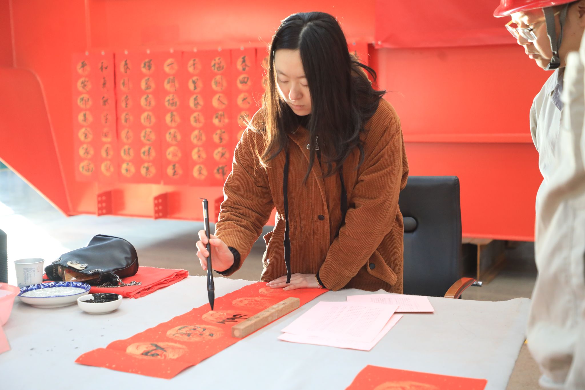 “乘風(fēng)破浪,久久為功,再鑄太重新輝煌;盛世龍騰,挑戰(zhàn)自我,振興崛起太重夢”“一帆風(fēng)順年年好,萬事如意步步高”……鋪紙、蘸墨、起筆,大家揮毫潑墨、激情書寫,在紅彤彤的喜慶與希冀中,將用心挑選的文字用藝術(shù)的形式展現(xiàn)出來,一幅幅遒勁有力、清爽灑脫的新春祝福,帶著清新的墨香躍然紙上。