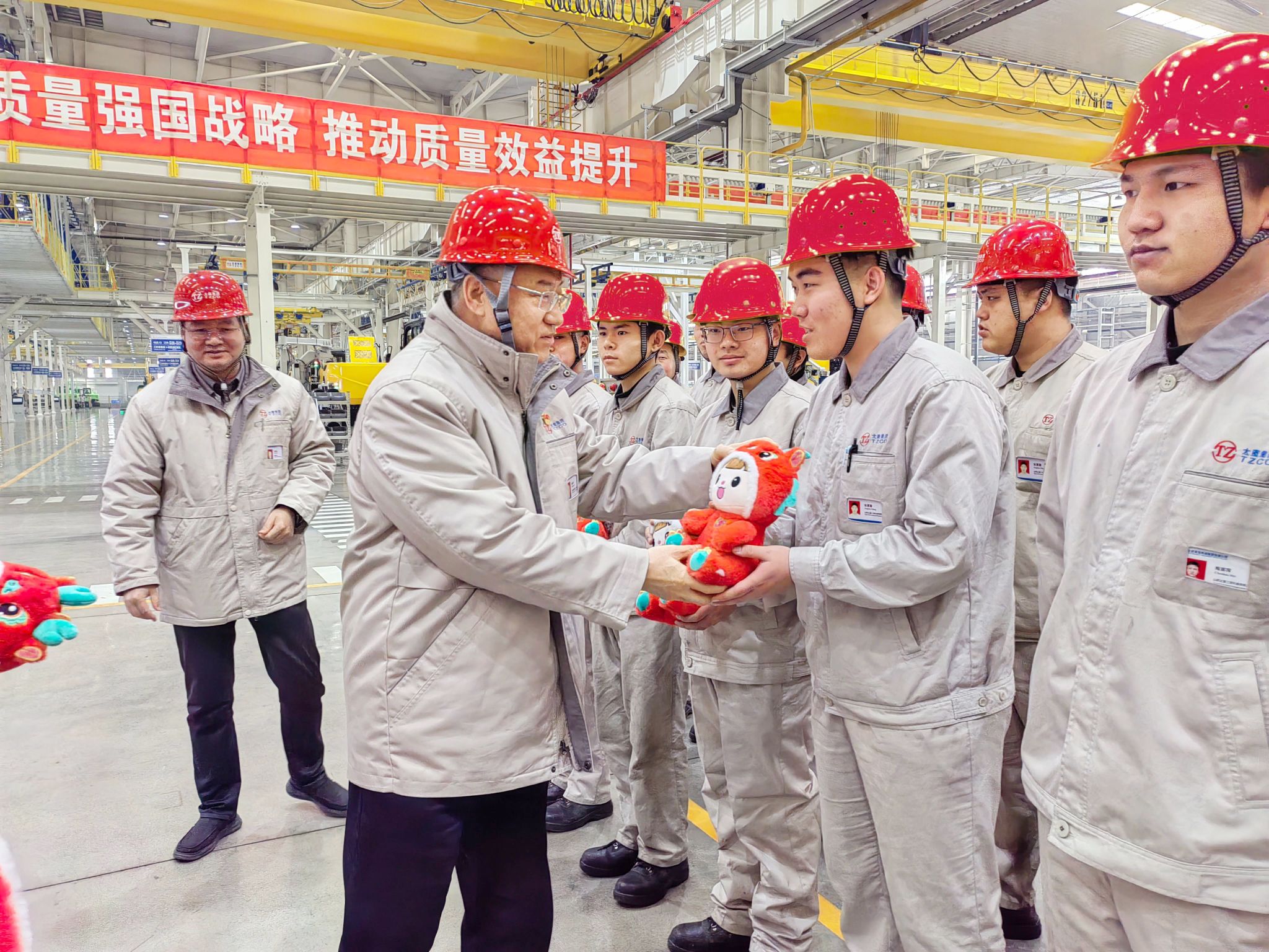 “新春快樂!祝太重蒸蒸日上!”中挖裝配生產(chǎn)現(xiàn)場,職工們個個精神抖擻、意氣風(fēng)發(fā),齊聲喊出新春祝福。“給大家拜個早年,祝廣大干部職工及職工家屬新年快樂!龍年將至,祝大家龍馬精神、龍騰虎躍!”韓珍堂說,2023年,工程機(jī)械公司做了大量卓有成效的工作,對大家的辛勤付出表示感謝,并用“三個快”總結(jié)了一年來取得的成績。建設(shè)速度快——從2022年5月開工奠基到2023年7月建成投產(chǎn),14個月時間建成了世界上單一工廠規(guī)模最大、工序最全的挖掘機(jī)智慧工廠,創(chuàng)造了同行業(yè)最好水平。新品開發(fā)快——去年共設(shè)計完成45款挖機(jī)、8款旋挖鉆機(jī),實現(xiàn)0.8-150噸級全系列、多動力覆蓋。融合發(fā)展快——大家因為共同的事業(yè),從五湖四海相聚到一起,專業(yè)人才相互碰撞融合,鑄就了強(qiáng)大的凝聚力、向心力,為公司高質(zhì)量高速度發(fā)展奠定了堅實基礎(chǔ)。韓珍堂強(qiáng)調(diào),今年是公司轉(zhuǎn)型新生的攻堅之年。集團(tuán)公司發(fā)展任務(wù)艱巨繁重,而最艱巨、最繁重的任務(wù)還在工程機(jī)械公司。只有以批量化作基礎(chǔ)、綠色裝備為底色,我們的工程機(jī)械才能更有市場、更有競爭力!打造“規(guī)?;?、批量化、效益化”產(chǎn)品,工程機(jī)械要率先實現(xiàn);打造“綠色化、智能化、國產(chǎn)化”產(chǎn)品,工程機(jī)械也要率先實現(xiàn)!要開疆拓土,打造國際化公司,讓太重產(chǎn)品、太重品牌揚帆出海、遍布世界舞臺。要對標(biāo)學(xué)習(xí)、超越先進(jìn)、成為先進(jìn),打造引領(lǐng)機(jī)械行業(yè)最高水平的智慧工廠!這是對大家的期望,也是全體太重人要為之奮斗的目標(biāo)!字字懇切、句句提氣又溫情滿滿。隨后韓珍堂將新年吉祥物一一送至職工手中。現(xiàn)場的干部職工深受鼓舞、倍感振奮,在溫暖中收獲了奮進(jìn)的力量,更加堅定了未來努力的方向。大家紛紛表示,將進(jìn)一步增強(qiáng)責(zé)任感、使命感,認(rèn)真履職盡責(zé)、主動擔(dān)當(dāng)作為,爭做轉(zhuǎn)型發(fā)展的排頭兵,為實現(xiàn)振興崛起的“太重夢”不懈奮斗!