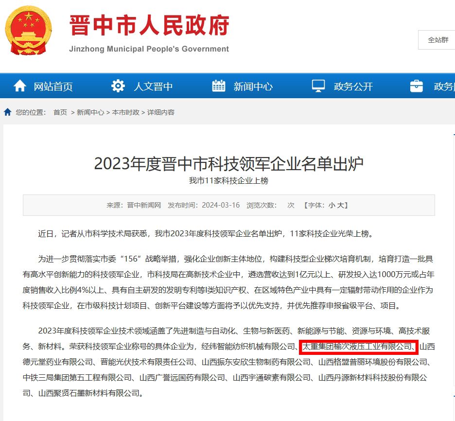 近日,2023年度晉中市科技領軍企業(yè)名單公布,太重榆液憑借卓越的技術創(chuàng)新、優(yōu)秀的市場表現以及對地方經濟的突出貢獻光榮上榜,進一步叫響了太重品牌,提升了公司行業(yè)影響力。