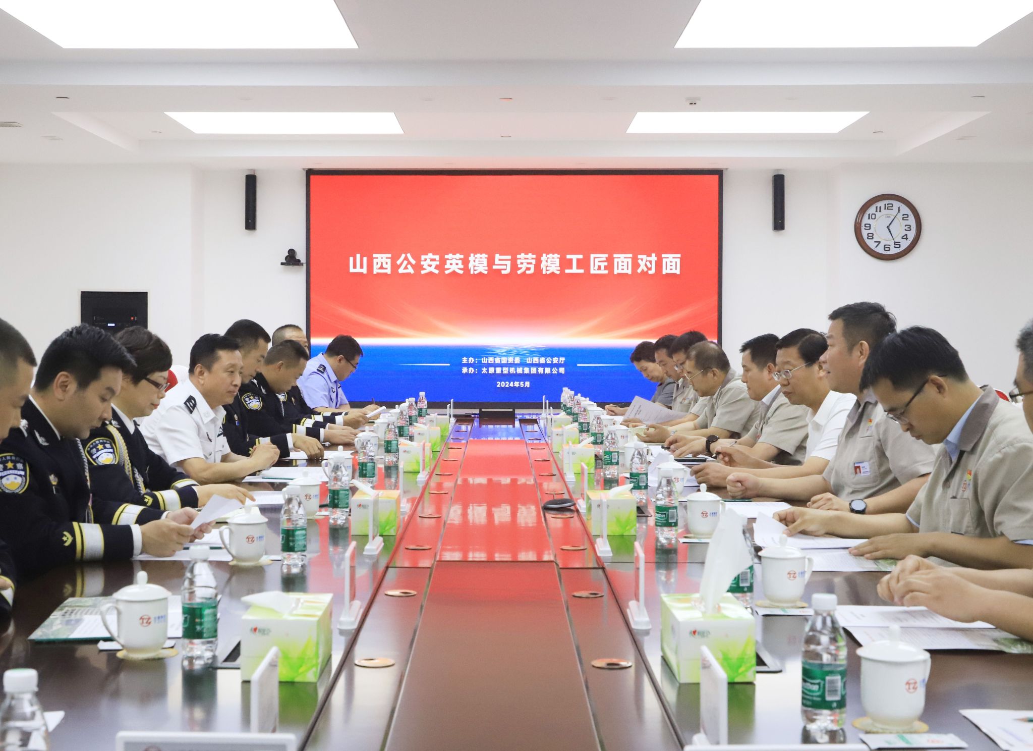 會(huì)后,山西公安英模與太重勞模工匠舉行了面對(duì)面交流會(huì),雙方進(jìn)行了充分的交流發(fā)言,勞模工匠們紛紛表示,聽(tīng)了各位英模的事跡后非常感動(dòng),第一次真切的了解到公安一線工作的辛苦,對(duì)公安英模們深植于心的人民情懷和敢于開(kāi)拓創(chuàng)新的精神感到敬佩,向公安英模和一線干警表示崇高的敬意。公安英模也對(duì)太重勞模工匠為中國(guó)裝備制造業(yè)發(fā)展作出的貢獻(xiàn)表示感謝。他們表示,在參觀太重展覽館時(shí),聽(tīng)到最多的詞就是“第一”、“最大”,無(wú)不體現(xiàn)了太重作為共和國(guó)長(zhǎng)子的信心與底氣,各位勞模工匠為加快推進(jìn)中國(guó)式現(xiàn)代化、發(fā)展新質(zhì)生產(chǎn)力作出了不凡的貢獻(xiàn),是學(xué)習(xí)的榜樣,值得敬佩。
