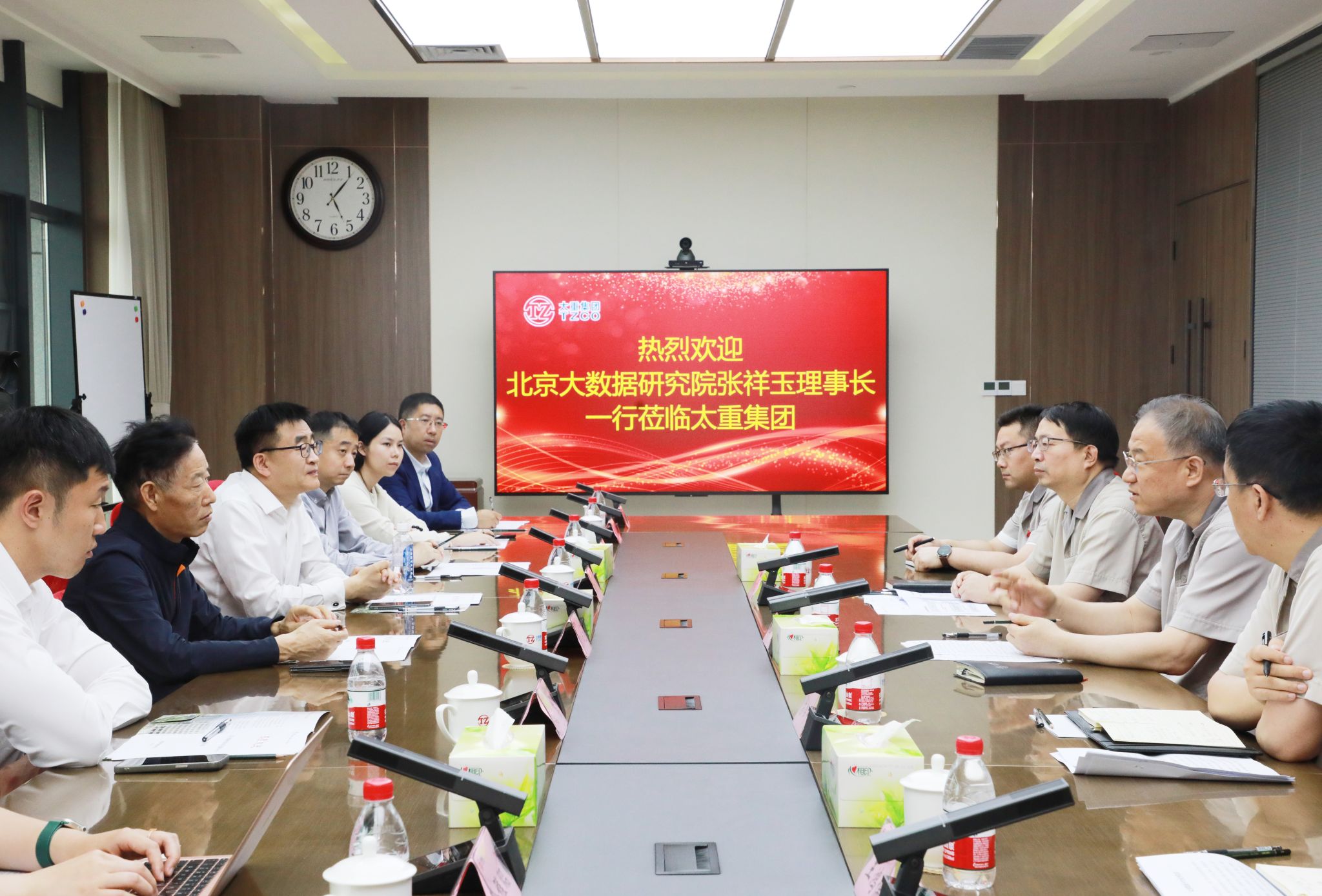 韓珍堂對客人一行的到來表示歡迎,并對公司產(chǎn)業(yè)結構、科研布局、智慧工廠建設等情況進行介紹。他表示,太重是有著74年歷史的裝備制造企業(yè),打造百年老店需要再接再厲、開放創(chuàng)新。作為科技創(chuàng)新的主體,太重緊跟國家戰(zhàn)略需求和技術發(fā)展趨勢,依托全國重點實驗室和國家級企業(yè)技術中心,充分發(fā)揮“一重點、一中心、多基地”研發(fā)體系平臺輻射作用,不斷做強傳統(tǒng)產(chǎn)品、做優(yōu)戰(zhàn)新產(chǎn)品、做精批量產(chǎn)品,推動制造業(yè)高端化、智能化、綠色化轉型升級。智能工廠是制造業(yè)未來發(fā)展的方向,全面深化改革以來,太重向新聚力、以“智”提效,全面推動產(chǎn)業(yè)數(shù)字化,以建設燈塔工廠、智能工廠、黑燈工廠為牽引進行數(shù)智化升級,努力打造數(shù)實融合的行業(yè)標桿。19個月建成太重智能高端裝備產(chǎn)業(yè)園區(qū),14個月建成智能高端液壓挖掘機產(chǎn)業(yè)園區(qū),充分彰顯了太重速度、太重智慧、太重力量,“一總部、多園區(qū)”的格局加速擴展,太重十里新城正成為制造業(yè)振興崛起的重要地標。北京大數(shù)據(jù)研究院是國際大數(shù)據(jù)發(fā)展的科研高地,希望能夠發(fā)揮智庫優(yōu)勢,與太重在技能培訓、科技創(chuàng)新、項目咨詢、數(shù)字化轉型等方面深度合作,以數(shù)字賦能“智”造升級,為企業(yè)高質量高速度發(fā)展插上大數(shù)據(jù)騰飛的翅膀。