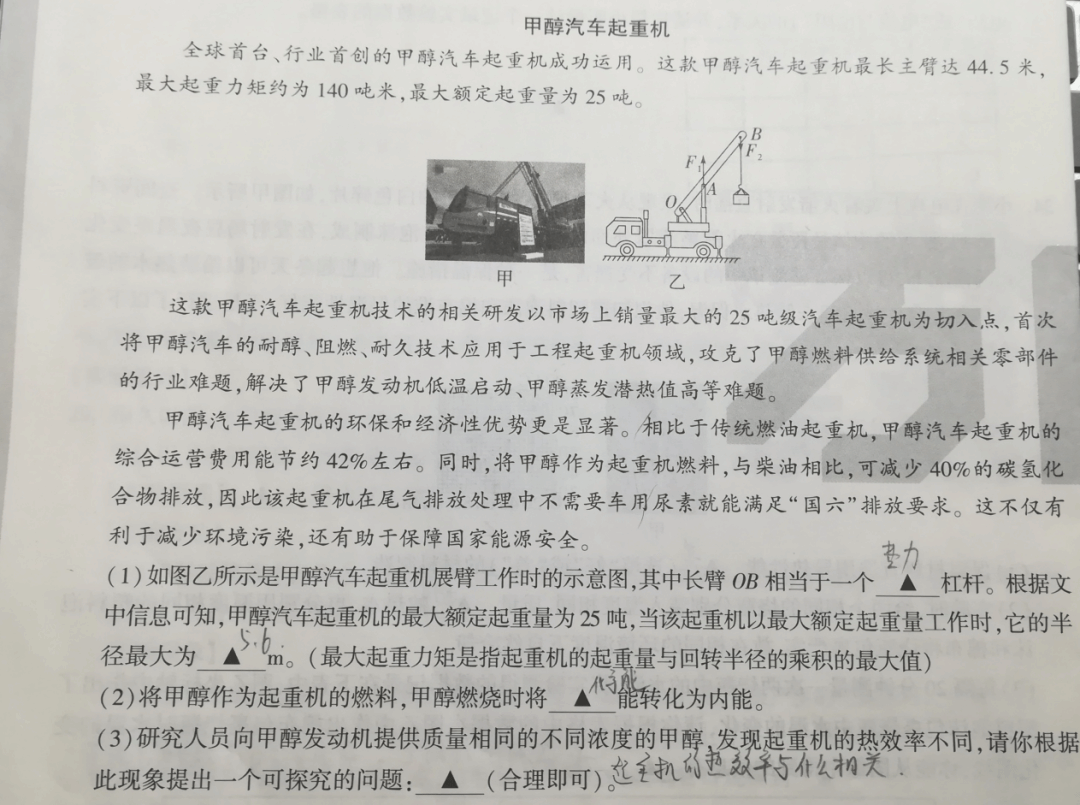 全球首臺(tái)、行業(yè)首創(chuàng)的太重甲醇汽車起重機(jī)投入使用后,人民日?qǐng)?bào)、人民網(wǎng)、科技日?qǐng)?bào)等國家、省級(jí)權(quán)威媒體高度關(guān)注、紛紛報(bào)道。今天我們的這款25噸甲醇汽車起重機(jī)——TZGT25M也出現(xiàn)在初三學(xué)生的物理考卷上。