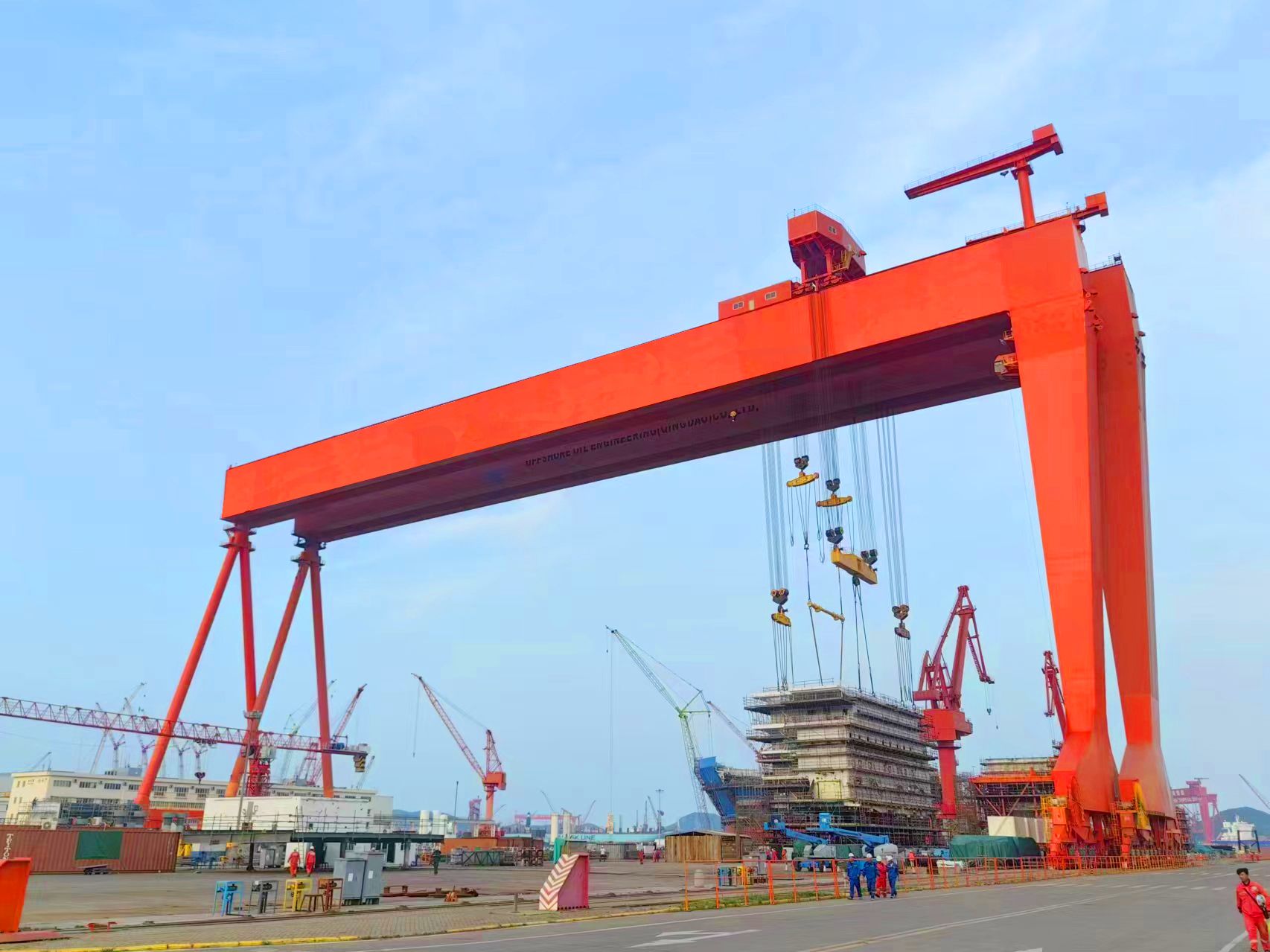 造船門式起重機作為太重的拳頭產(chǎn)品,是橋式起重機的一種變形型式,不僅繼承了橋式起重機的固有優(yōu)勢,還具有場地利用率高、作業(yè)范圍大、適應(yīng)面廣、通用性強等特點。投入運行后,能夠為業(yè)主船塢內(nèi)在建項目提供更大的起吊能力,在項目建造、碼頭船舶的裝卸作業(yè)中擔(dān)大任、挑大梁。此次簽單的兩臺設(shè)備中,其中一臺的起重量高達(dá)1200噸,起升高度不低于76米,跨距162米,作業(yè)區(qū)域可以覆蓋用戶整個總裝場地,綜合性能達(dá)到國際先進(jìn)水平,設(shè)備投用后,能大幅度提高用戶總裝分段工作效率,提升用戶市場競爭力。另一臺則用于千噸級模塊的總裝、搭載及其大型設(shè)備的吊裝作業(yè)。
