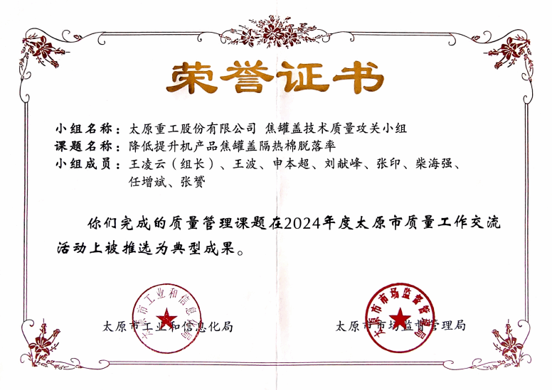 近日,2024年度太原市質(zhì)量工作交流活動(dòng)順利舉行,太重冶金分公司售后服務(wù)工部獲評(píng)“質(zhì)量信得過(guò)班組”,5個(gè)QC小組項(xiàng)目均被推選為典型成果。其中“提升板材矯直機(jī)現(xiàn)場(chǎng)安裝交檢一次性合格率”“降低提升機(jī)產(chǎn)品焦罐蓋隔熱棉脫落率”課題還被推薦參加山西省質(zhì)量交流活動(dòng)成果發(fā)布。