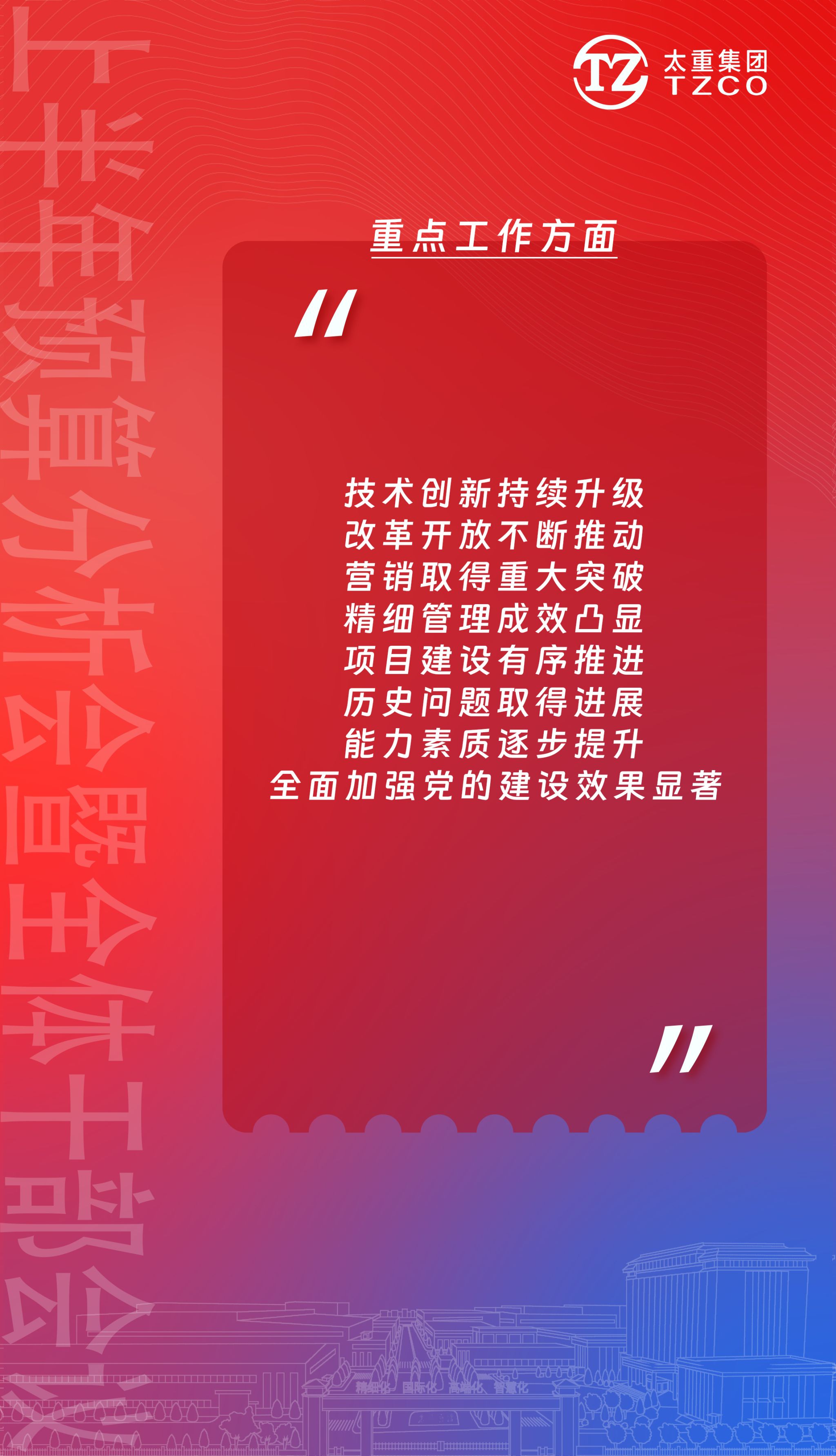 期待不容辜負(fù),使命不容懈怠!讓我們上下同欲、團(tuán)結(jié)拼搏,鉚足干勁加油干,積勢蓄能攀新高,共同將太重建設(shè)成為跨越時(shí)空、基業(yè)長青、朝氣蓬勃的百年老店!
