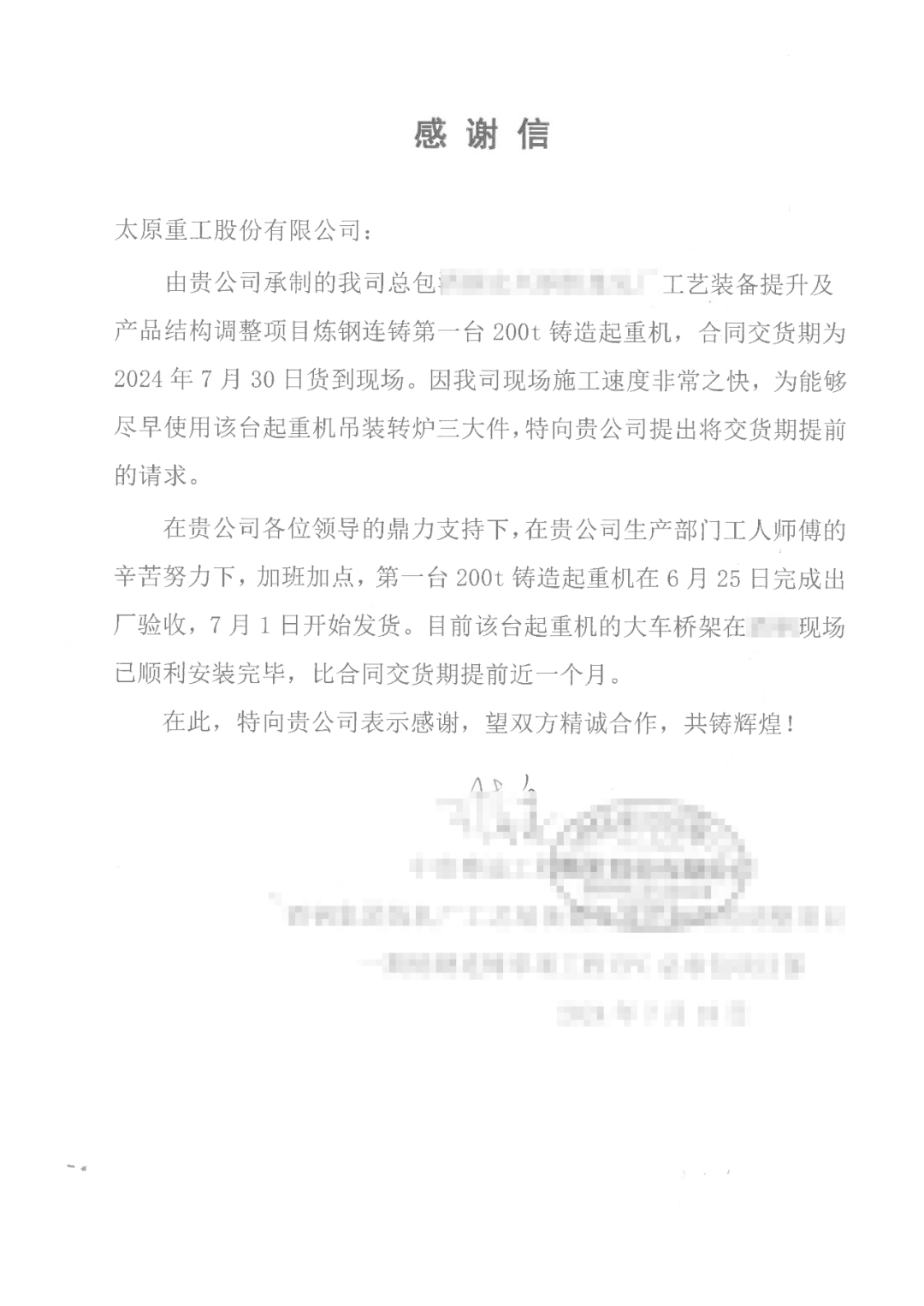 想用戶之所想,急用戶之所急。今年年初,公司與用戶首次合作便成功簽訂多個起重設備訂單。鑒于自身工程進度需要,用戶向太重提出提前交付一臺200噸鑄造起重機的請求。時間緊、任務重、質量要求高,面對“用戶之所急”,公司積極響應,及時協(xié)調技術和生產部門,最終比合同交貨期提前近一個月交付設備,確保了用戶工程項目順利投產?!巴p方精誠合作,共鑄輝煌!”無疑是對太重一諾千金的高度贊揚。