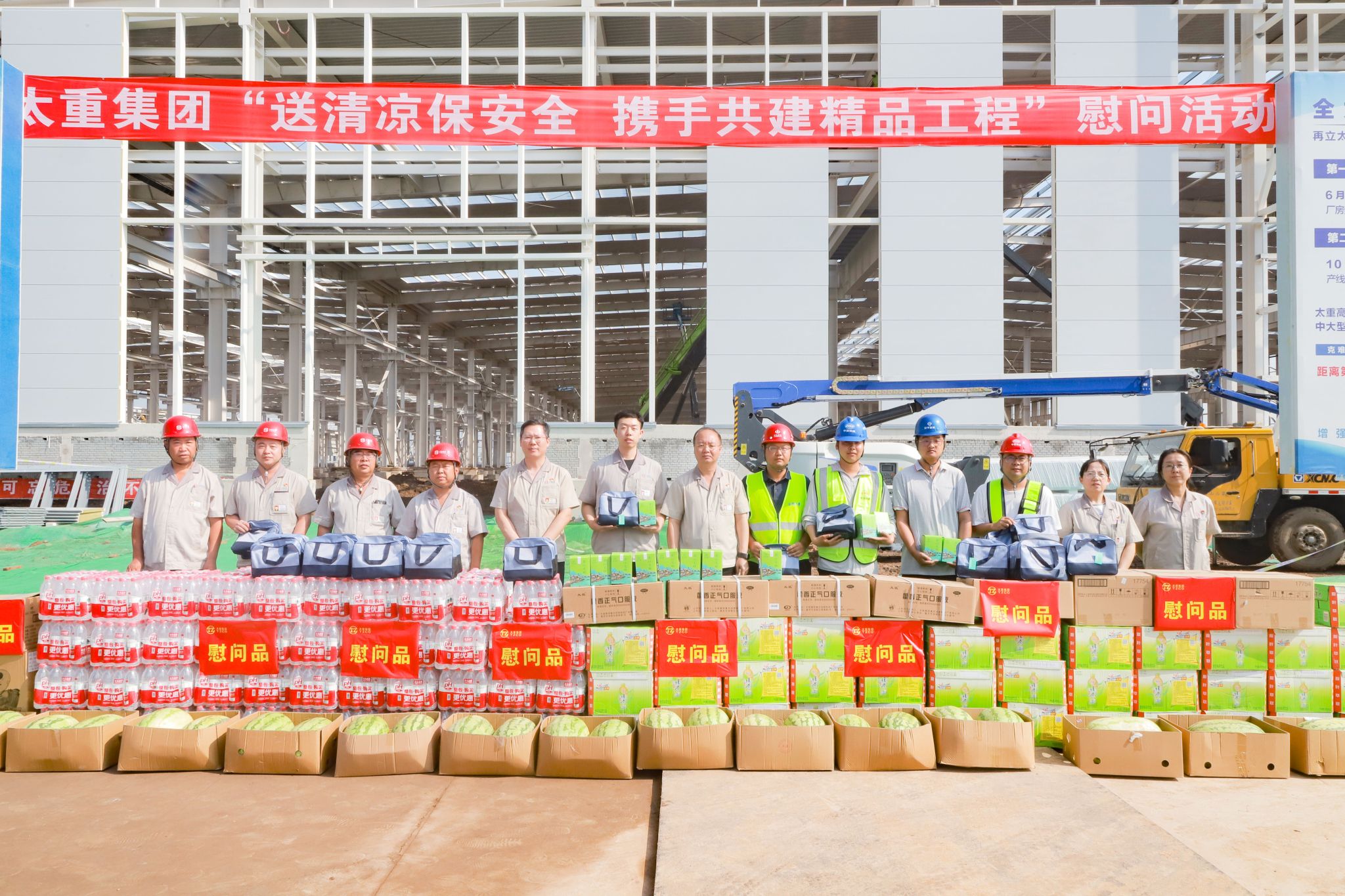 當(dāng)前,公司將工程項(xiàng)目建設(shè)作為推動(dòng)高質(zhì)量高速度發(fā)展的“強(qiáng)引擎”和“硬支撐”,加速推進(jìn)了一批有影響、有實(shí)力的工程項(xiàng)目,各項(xiàng)目組緊盯目標(biāo),戰(zhàn)盛夏、斗酷暑,搶進(jìn)度、重安全,不畏困難、奮勇拼搏,有條不紊地推進(jìn)項(xiàng)目建設(shè)工作。為了表達(dá)集團(tuán)公司對(duì)項(xiàng)目一線參建職工的關(guān)懷與感謝,把濃濃的關(guān)心關(guān)愛傳遞到一線職工的身邊,慰問組一行先后深入工程起重機(jī)、四輪一帶、工程齒輪箱、全國(guó)重點(diǎn)實(shí)驗(yàn)室等項(xiàng)目,為在高溫下堅(jiān)守崗位的一線職工送去洗漱包、飲品、藥品、西瓜等清涼大禮包。活動(dòng)期間,慰問組一行詳細(xì)了解現(xiàn)場(chǎng)作業(yè)情況及項(xiàng)目部安全措施落實(shí)情況,確保職工在高溫作業(yè)中的安全與健康,要求項(xiàng)目建設(shè)責(zé)任部門要時(shí)刻關(guān)注高溫施工及汛期安全,自覺強(qiáng)化安全意識(shí),堅(jiān)決杜絕違章作業(yè),及時(shí)消除安全隱患;要緊盯項(xiàng)目建設(shè)時(shí)間節(jié)點(diǎn),搶抓施工黃金期,在保證質(zhì)量和安全的前提下,全力推動(dòng)項(xiàng)目建設(shè)提速增效。