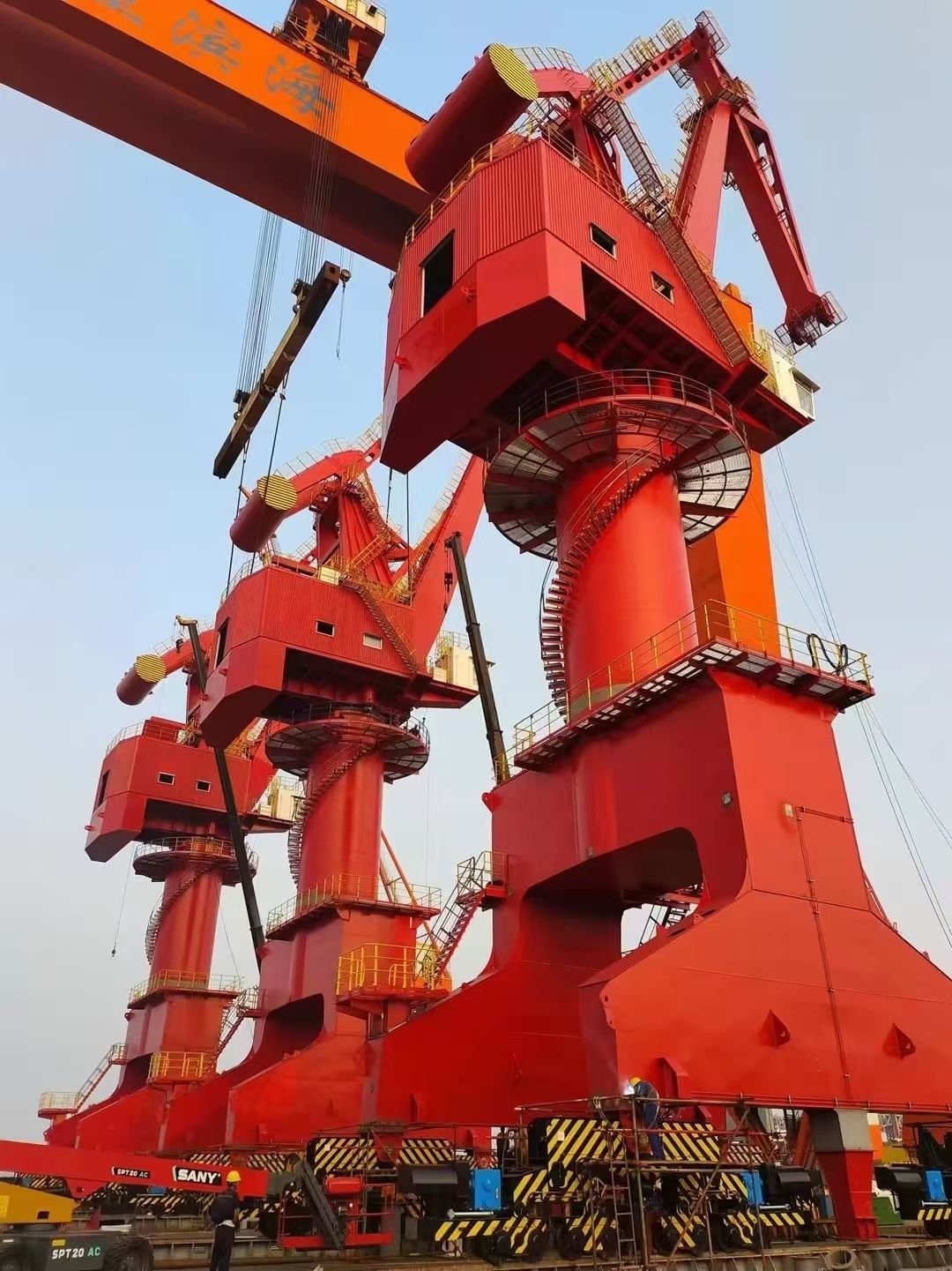 門座式起重機,作為高效的全回轉(zhuǎn)臂架型有軌起重機,服務(wù)于港口裝卸及造船施工,是港口作業(yè)的主力設(shè)備。為滿足用戶實際使用要求,三臺門座式起重機均搭載起重機監(jiān)測管理平臺——CMS系統(tǒng)。它作為港口機械的“智能管家”,可為用戶提供詳盡、實時的起重機狀態(tài)和故障信息,是協(xié)助用戶實現(xiàn)設(shè)備高效使用、故障檢測和信息化管理的重要手段。以成熟的技術(shù)打造卓越方案,性能優(yōu)越、高效穩(wěn)定,盡顯公司硬核實力。總裝發(fā)運期間,公司與技術(shù)團隊、用戶緊密協(xié)作,創(chuàng)新采用雙作業(yè)面策略,降低地面化組裝難度,安裝效率顯著提升。歷經(jīng)15天晝夜奮戰(zhàn),成功完成3臺起重機的核心部件總裝,單臺設(shè)備四連桿安裝更是創(chuàng)下13.5小時新紀錄,彰顯了太重速度。有條不紊地吊裝作業(yè)、聚精會神地滾裝發(fā)運……工作人員精益生產(chǎn)、高效組織,經(jīng)過100多天的默默付出后,“馴養(yǎng)員”終于讓這三只“機械鶴”振翅離巢,向用戶“飛”去。