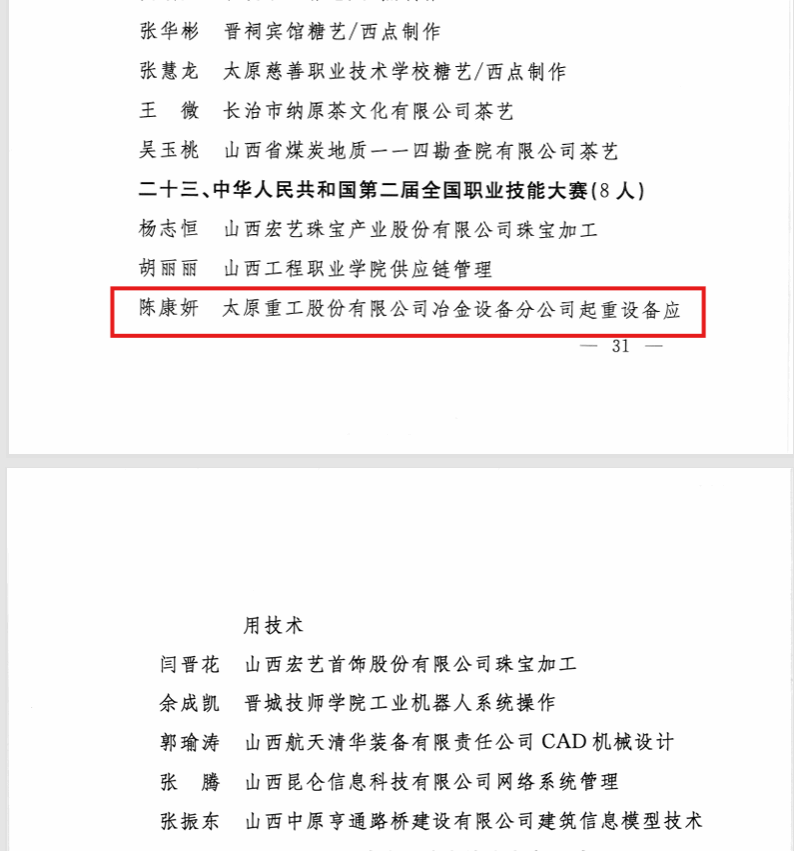 近日,山西省人民政府印發(fā)《關(guān)于授予2022—2023年度職業(yè)技能競(jìng)賽優(yōu)秀選手“三晉技術(shù)能手”稱號(hào)的決定》,來(lái)自太重冶金設(shè)備分公司的行車(chē)工陳康妍榜上有名!