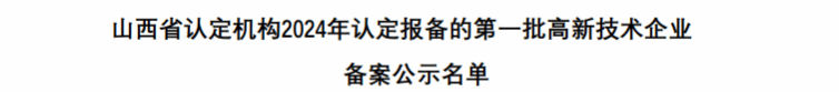 近日,全國高新技術(shù)企業(yè)認(rèn)定管理工作領(lǐng)導(dǎo)小組辦公室,正式發(fā)布《對(duì)山西省認(rèn)定機(jī)構(gòu)2024年認(rèn)定報(bào)備的第一批高新技術(shù)企業(yè)進(jìn)行備案的公告》。
