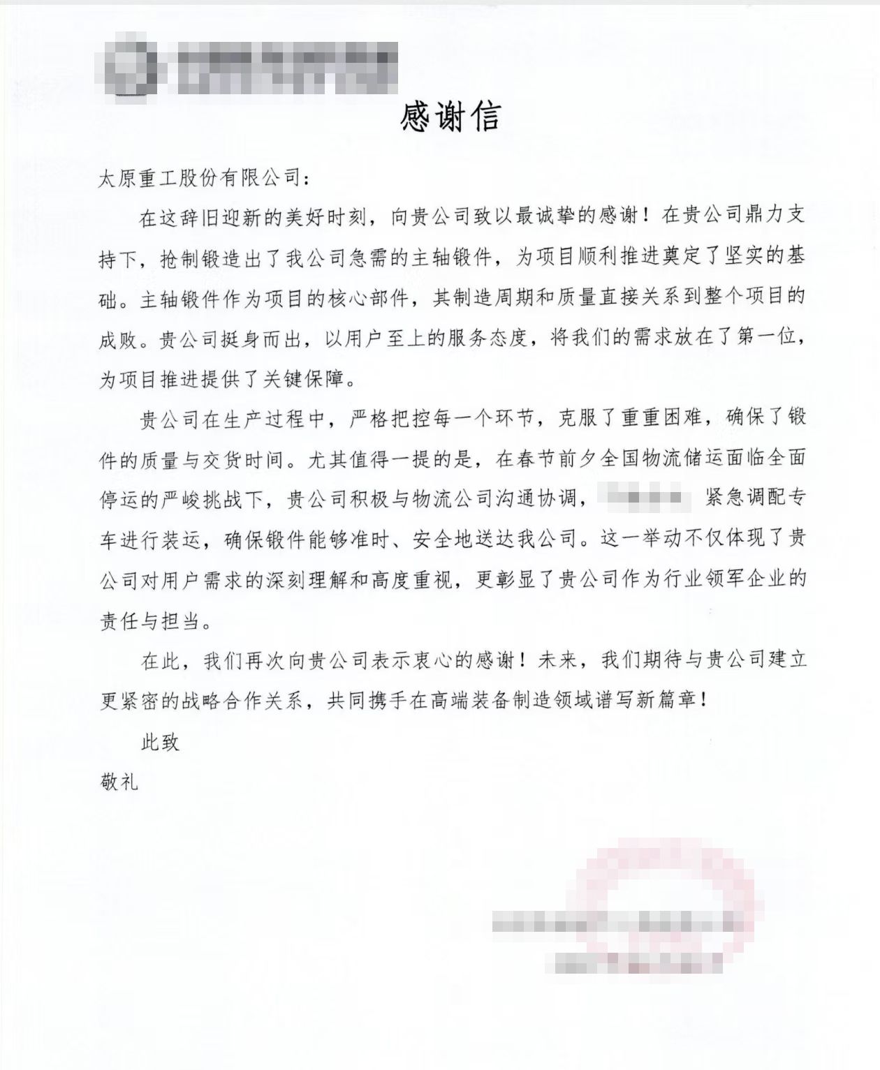 在這場(chǎng)緊急交付的“戰(zhàn)役”中,全體職工齊心協(xié)力、眾志成城,為用戶(hù)提供了最優(yōu)質(zhì)的產(chǎn)品及全方位的服務(wù),有力踐行了“用戶(hù)至上”的核心價(jià)值觀(guān)。這封感謝信,是太重一諾千金的見(jiàn)證,是用戶(hù)信任與支持太重品牌的最好詮釋。未來(lái),公司將持續(xù)奮進(jìn),不斷提升服務(wù)質(zhì)量,深入踐行服務(wù)創(chuàng)新,以極致服務(wù)贏得用戶(hù)信賴(lài),與合作伙伴攜手共進(jìn)、互利共贏,共同書(shū)寫(xiě)合作發(fā)展的新篇章。