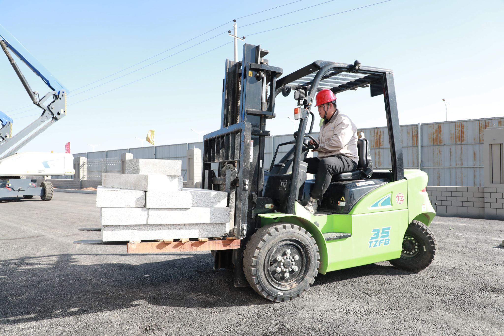 在這片機(jī)械轟鳴、車輛往來(lái)穿梭的忙碌工地上,一臺(tái)臺(tái)通體鮮綠的鋰電平衡重叉車格外醒目——這是公司自主研發(fā)的3.5噸新能源叉車,此刻正執(zhí)行路緣石轉(zhuǎn)運(yùn)任務(wù)。操作員精準(zhǔn)操控著叉臂,貨叉穩(wěn)穩(wěn)嵌入路緣石底部托盤(pán),隨著液壓桿伸縮,近一米長(zhǎng)的青灰色石料被平穩(wěn)托起。后輪轉(zhuǎn)向系統(tǒng)讓它們?cè)讵M窄空間游刃有余,在擺尾時(shí)劃出利落弧線,整車如游魚(yú)般輕盈轉(zhuǎn)向。工人笑著稱贊道:“這車好啊,是我開(kāi)過(guò)最靈活的!”