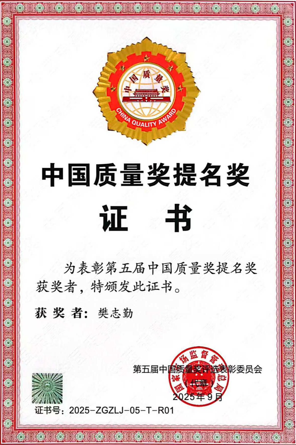 第五屆中國質(zhì)量獎?wù)筋C發(fā)