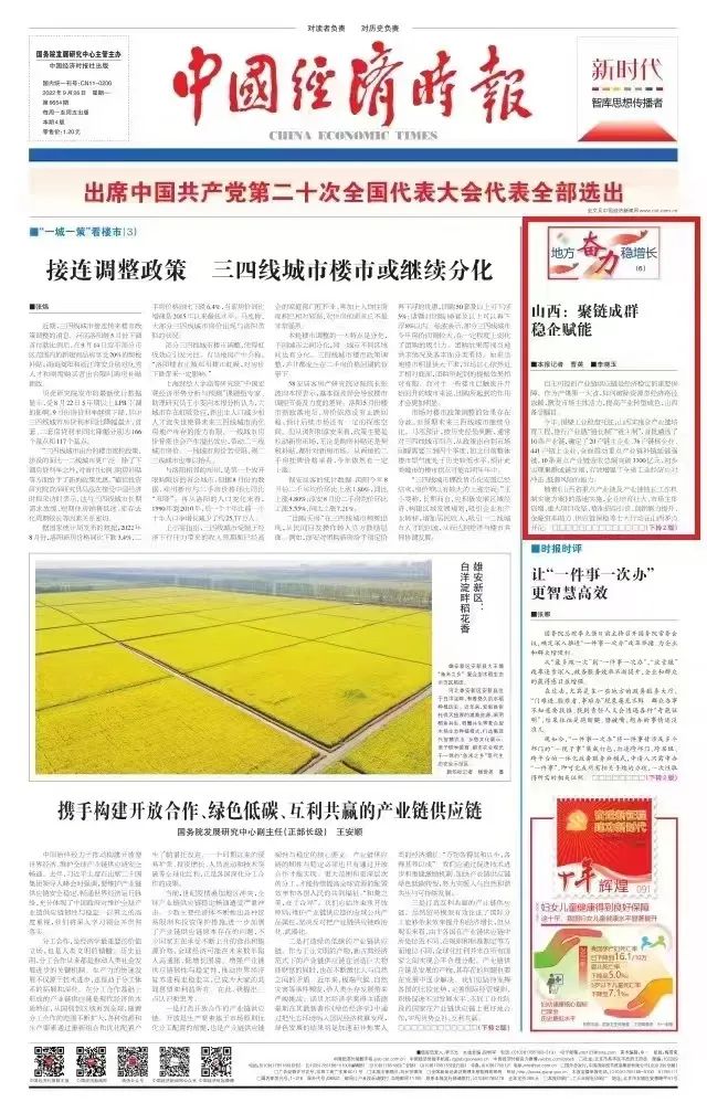 今日,中國經(jīng)濟時報頭版以《山西:聚鏈成群 穩(wěn)企賦能》為題,重點關(guān)注太重集團(tuán)憑借在高端裝備制造和風(fēng)電裝備領(lǐng)域的突出優(yōu)勢,成為山西省唯一的“雙鏈主”企業(yè),主動發(fā)揮“鏈主”企業(yè)的引領(lǐng)支撐作用,精準(zhǔn)延鏈補鏈強鏈,推動形成全省“一企帶一鏈、一鏈帶一片”的產(chǎn)業(yè)發(fā)展格局。