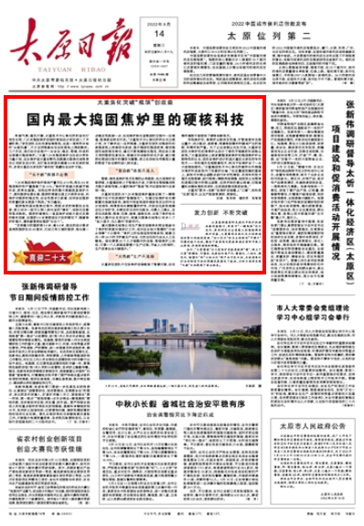 9月14日,太原日報頭版頭條《喜迎二十大》專欄,刊發(fā)文章《太重焦化突破“瓶頸”創(chuàng)效益 國內(nèi)最大搗固焦爐里的硬核科技》,報道太重集團聚焦“雙碳”目標,加快培育能源科技創(chuàng)新領(lǐng)域新路徑,從具備制造國際先進水平焦爐機械成套設(shè)備能力,到首開“一鍵煉焦”技術(shù)先河,再到研發(fā)出全國最大的智能搗固焦爐設(shè)備,“核心技術(shù)”的自主創(chuàng)新和“卡脖子”問題的逐個攻破,推動了我國焦化裝備制造在國際市場上從跟跑、并跑到領(lǐng)跑的跨越。