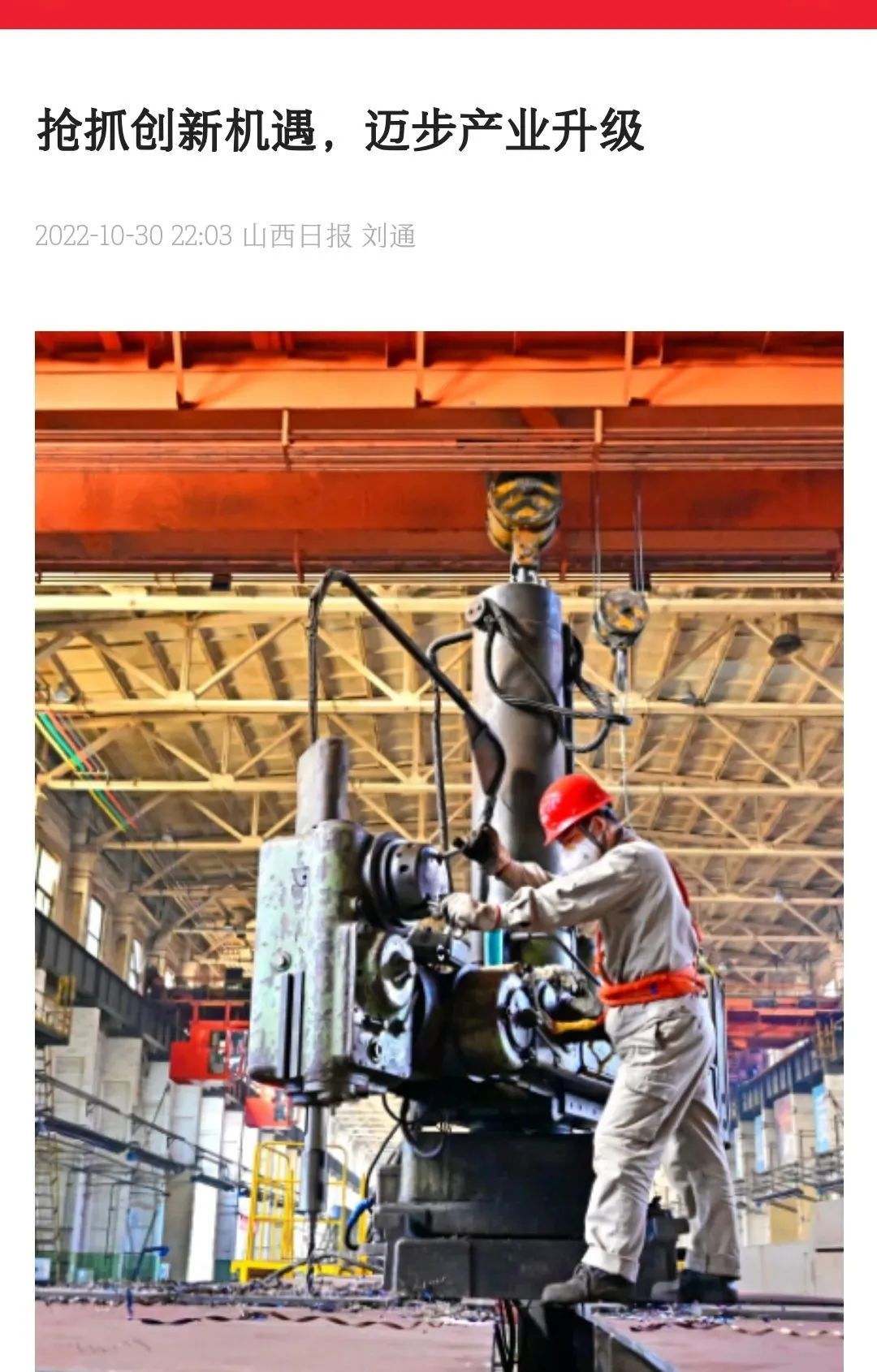 10月30日,山西日報以《搶抓創(chuàng)新機遇,邁步產(chǎn)業(yè)升級》為題,對太重集團加大工藝技術創(chuàng)新取得的新突破進行報道。全面深化改革以來,太重集團堅持改革創(chuàng)新,聚焦智能設計、智能制造、智能產(chǎn)品、智能服務,全力推動“制造”向“智造”轉(zhuǎn)型升級,持續(xù)提升制造業(yè)的技術含量,賦能公司高質(zhì)量高速度發(fā)展。