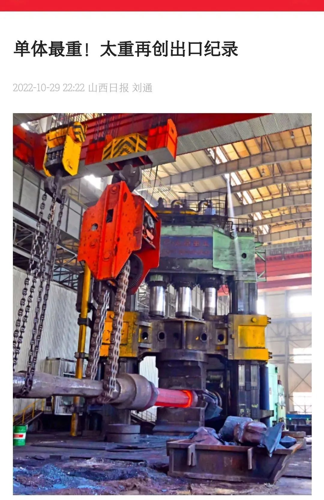 近日,山西日報以《單體最重!太重再創(chuàng)出口紀錄》為題,對太重集團高端裝備制造領(lǐng)域的新突破進行報道。太重集團堅持以“精細化、國際化、高端化、智能化”為方向,以智能制造、科技創(chuàng)新為動能,在轉(zhuǎn)型升級中展現(xiàn)新作為,積極履行好高端裝備制造產(chǎn)業(yè)鏈“鏈主”企業(yè)責任,持續(xù)加大關(guān)鍵核心技術(shù)攻關(guān)力度,為公司建設(shè)具有國際一流競爭力的現(xiàn)代智能裝備制造企業(yè)蓄勢賦能。