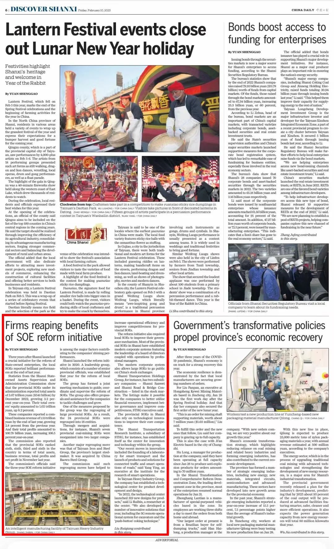 2月10日,中國(guó)日?qǐng)?bào)全英文刊發(fā)《Firms reaping benefits of SOE reform initiative》文章,報(bào)道太重扎實(shí)推進(jìn)國(guó)企改革三年行動(dòng),探索科技創(chuàng)新體系和高端裝備制造產(chǎn)業(yè)深度融合的發(fā)展新路,營(yíng)造了良好的創(chuàng)新生態(tài),夯實(shí)了公司轉(zhuǎn)型發(fā)展的堅(jiān)實(shí)根基。