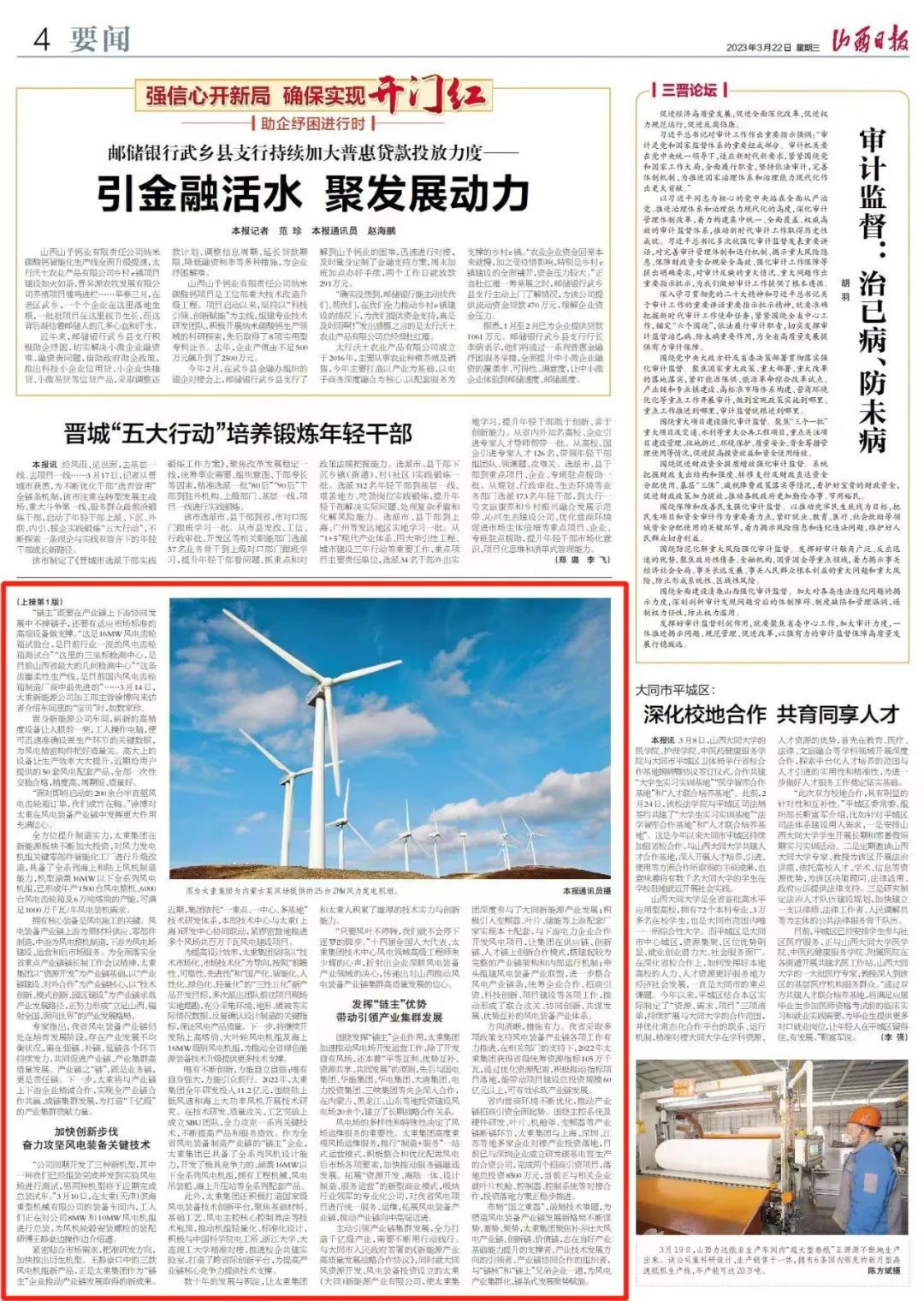今天,山西日?qǐng)?bào)頭版“重點(diǎn)產(chǎn)業(yè)鏈高質(zhì)量發(fā)展觀察”專欄,以“我省風(fēng)電產(chǎn)業(yè)集群化、鏈條式發(fā)展”為題,報(bào)道了太重集團(tuán)聞風(fēng)而動(dòng)、聚勢(shì)賦能,發(fā)展壯大風(fēng)電產(chǎn)業(yè)鏈、創(chuàng)新鏈、價(jià)值鏈的生動(dòng)實(shí)踐。
