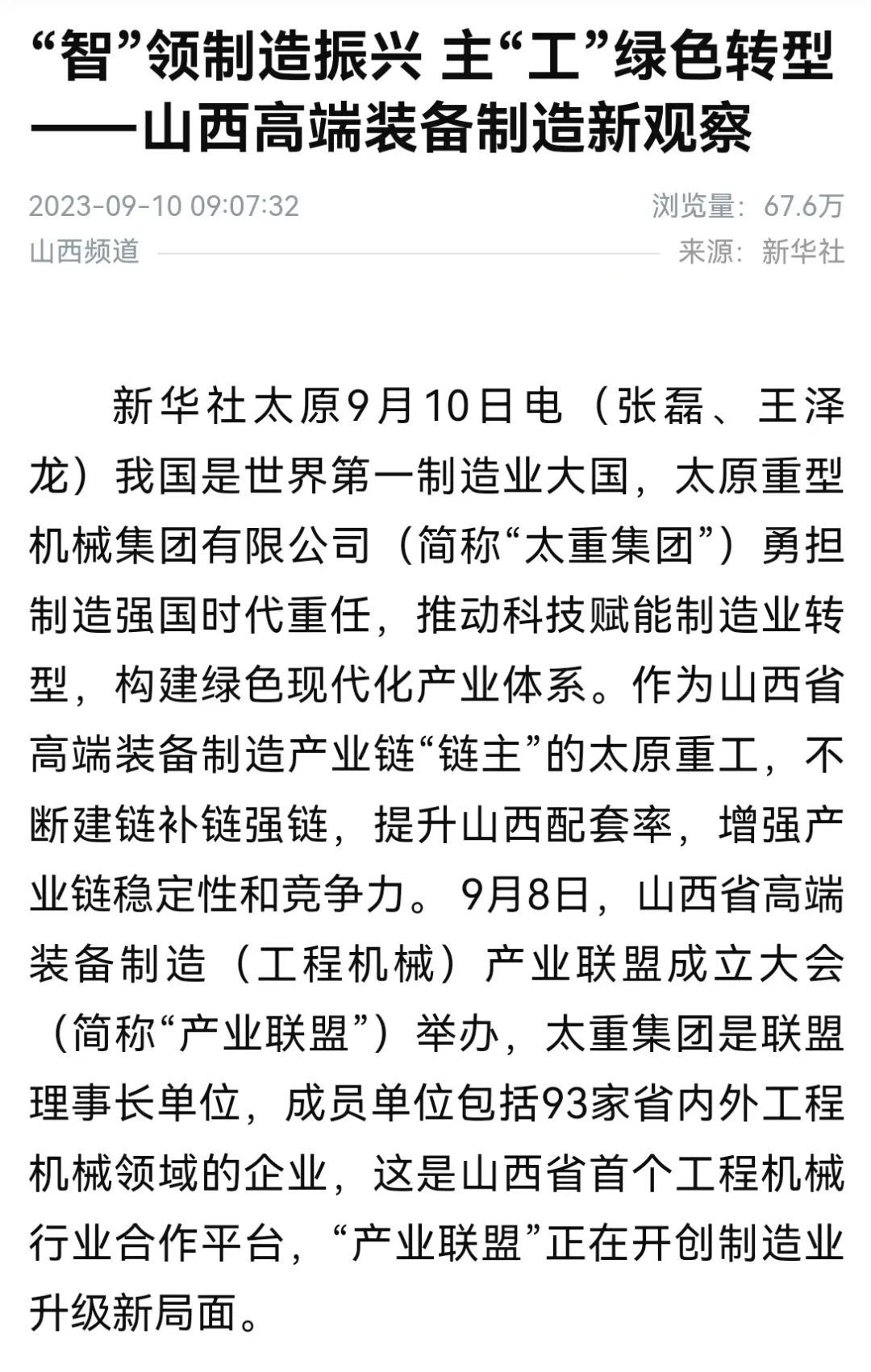 高端裝備制造產(chǎn)業(yè)鏈作為山西省培育打造的重點十條產(chǎn)業(yè)鏈之一。太重集團將以產(chǎn)業(yè)聯(lián)盟為契機,充分發(fā)揮“鏈主”企業(yè)的龍頭帶動作用,為山西省建設中部地區(qū)先進制造業(yè)基地做出積極貢獻。