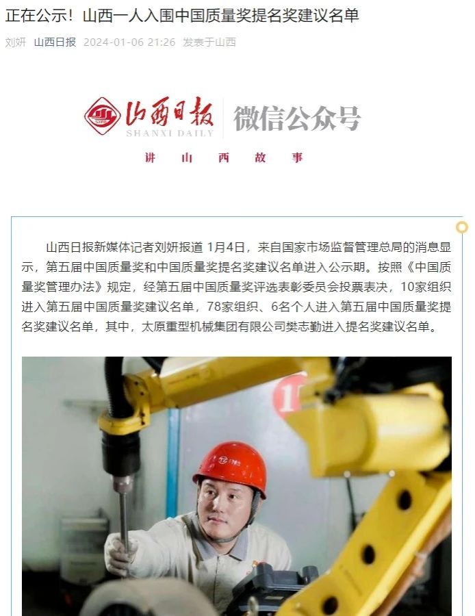1月4日,來自國家市場監(jiān)督管理總局的消息顯示,第五屆中國質(zhì)量獎(jiǎng)和中國質(zhì)量獎(jiǎng)提名獎(jiǎng)建議名單進(jìn)入公示期。按照《中國質(zhì)量獎(jiǎng)管理辦法》規(guī)定,經(jīng)第五屆中國質(zhì)量獎(jiǎng)評選表彰委員會(huì)投票表決,10家組織進(jìn)入第五屆中國質(zhì)量獎(jiǎng)建議名單,78家組織、6名個(gè)人進(jìn)入第五屆中國質(zhì)量獎(jiǎng)提名獎(jiǎng)建議名單,其中,太原重型機(jī)械集團(tuán)有限公司樊志勤進(jìn)入提名獎(jiǎng)建議名單。