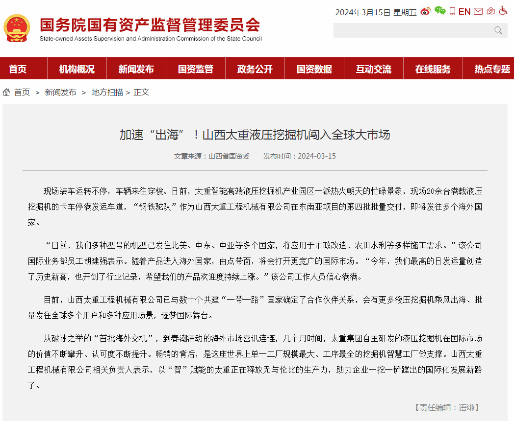 作為裝備制造業(yè)的領(lǐng)軍企業(yè),太重被格外關(guān)注,被寄予厚望。近日,國務(wù)院國有資產(chǎn)監(jiān)督管理委員會官網(wǎng)刊登了《加速“出?!?!山西太重液壓挖掘機(jī)闖入全球大市場》;山西新聞聯(lián)播也在《推動高質(zhì)量發(fā)展 深化全方位轉(zhuǎn)型》欄目中對太重進(jìn)行深入報道。