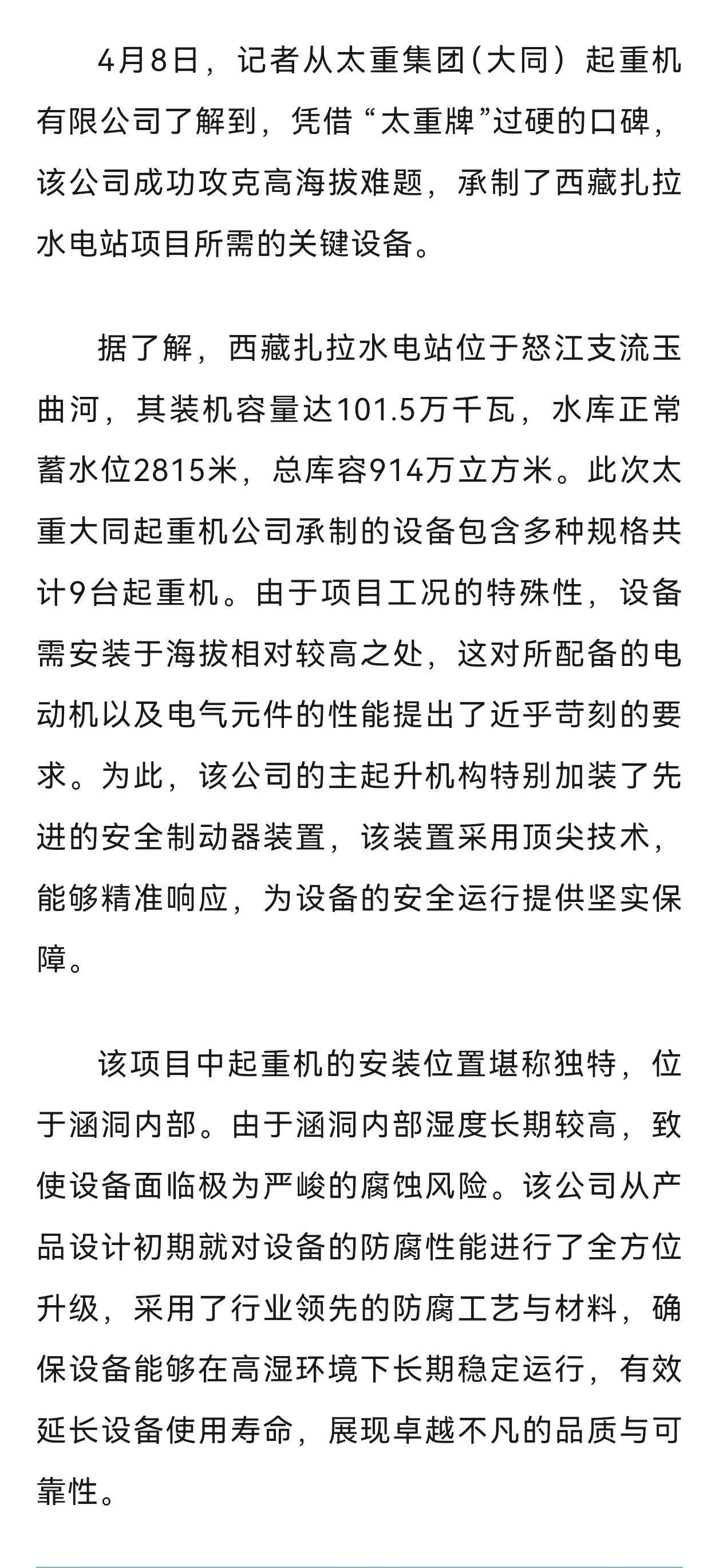 喜訊傳來,振奮人心!太重集團(tuán)(大同)起重機(jī)有限公司佳績不斷,再獲矚目。此前助力攀枝花項(xiàng)目,憑借出色表現(xiàn)受到媒體關(guān)注。4月9日,《大同日報》頭版再度聚焦報道,太重集團(tuán)(大同)起重機(jī)有限公司攻克高海拔難題,成功承制了西藏扎拉水電站項(xiàng)目關(guān)鍵設(shè)備承制任務(wù)。