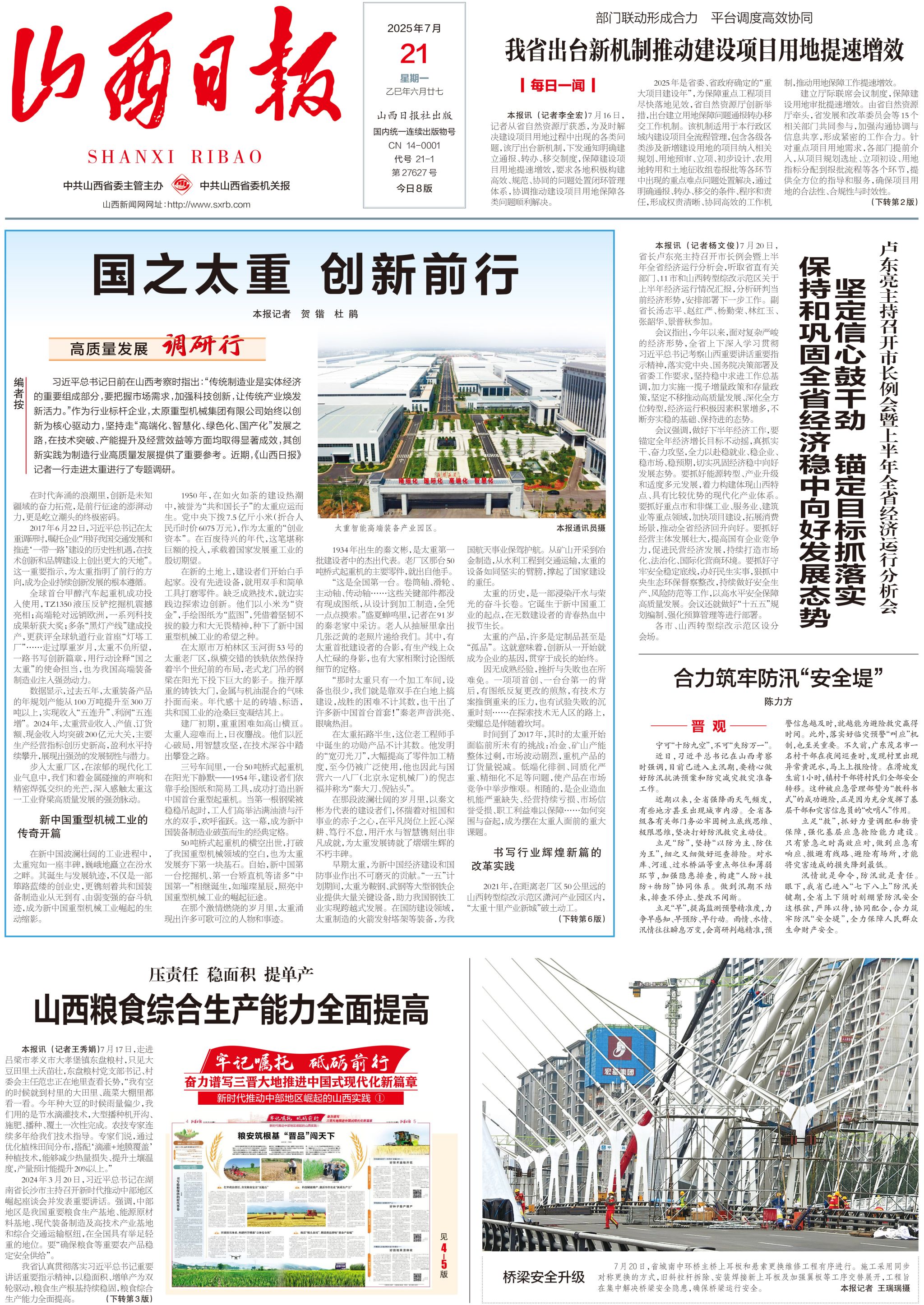 今日,山西日?qǐng)?bào)【高質(zhì)量發(fā)展調(diào)研行】專欄刊發(fā)重磅文章《國(guó)之太重 創(chuàng)新前行》,頭版頭條深度聚焦“共和國(guó)長(zhǎng)子”奮進(jìn)足跡,觸摸七十載不變的強(qiáng)國(guó)初心,展示新時(shí)代太重奔涌不息的創(chuàng)新脈動(dòng)!